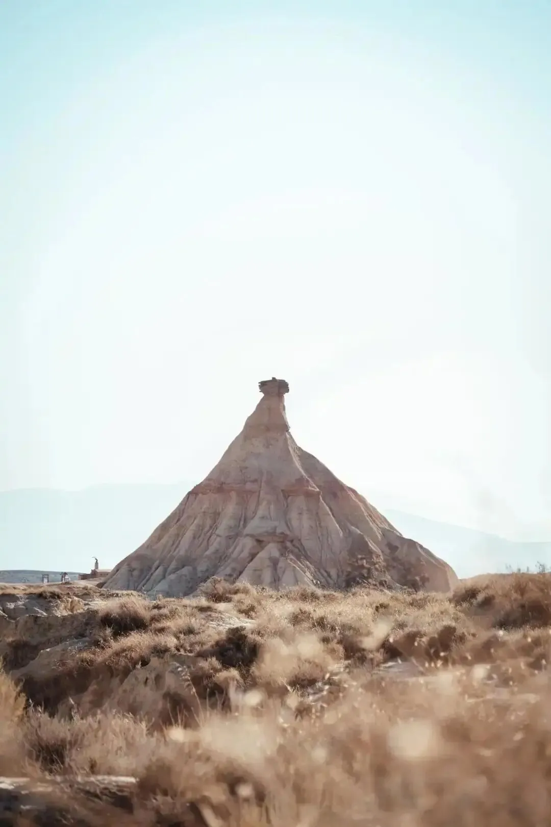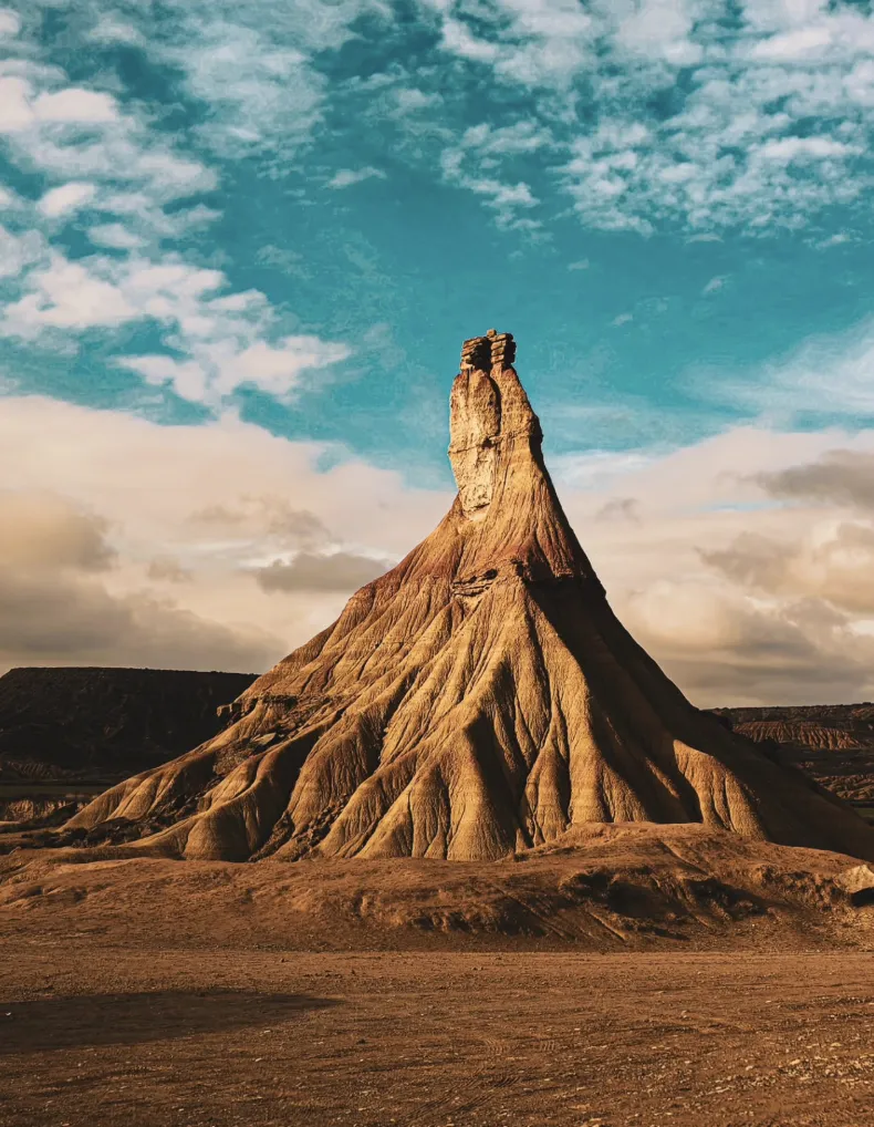 Las Bardenas最震撼的,是它极具辨识度的地貌景观。戈壁般的平原在眼前铺展开来,风化侵蚀形成的尖塔岩丘和沟壑纵横其间,孤立的丘陵在荒原上显得格外孤独而有力量。其中最具代表性的区域是白色巴尔德纳(Bardena Blanca),灰白色岩层层层堆叠,充满科幻感;而黑色巴尔德纳(Bardena Negra)则被稀疏的松林覆盖,色调更深,也更显神秘。标志性的Castildetierra岩丘如同一座天然雕塑,矗立在荒漠中央,成为这里最具象征性的画面。