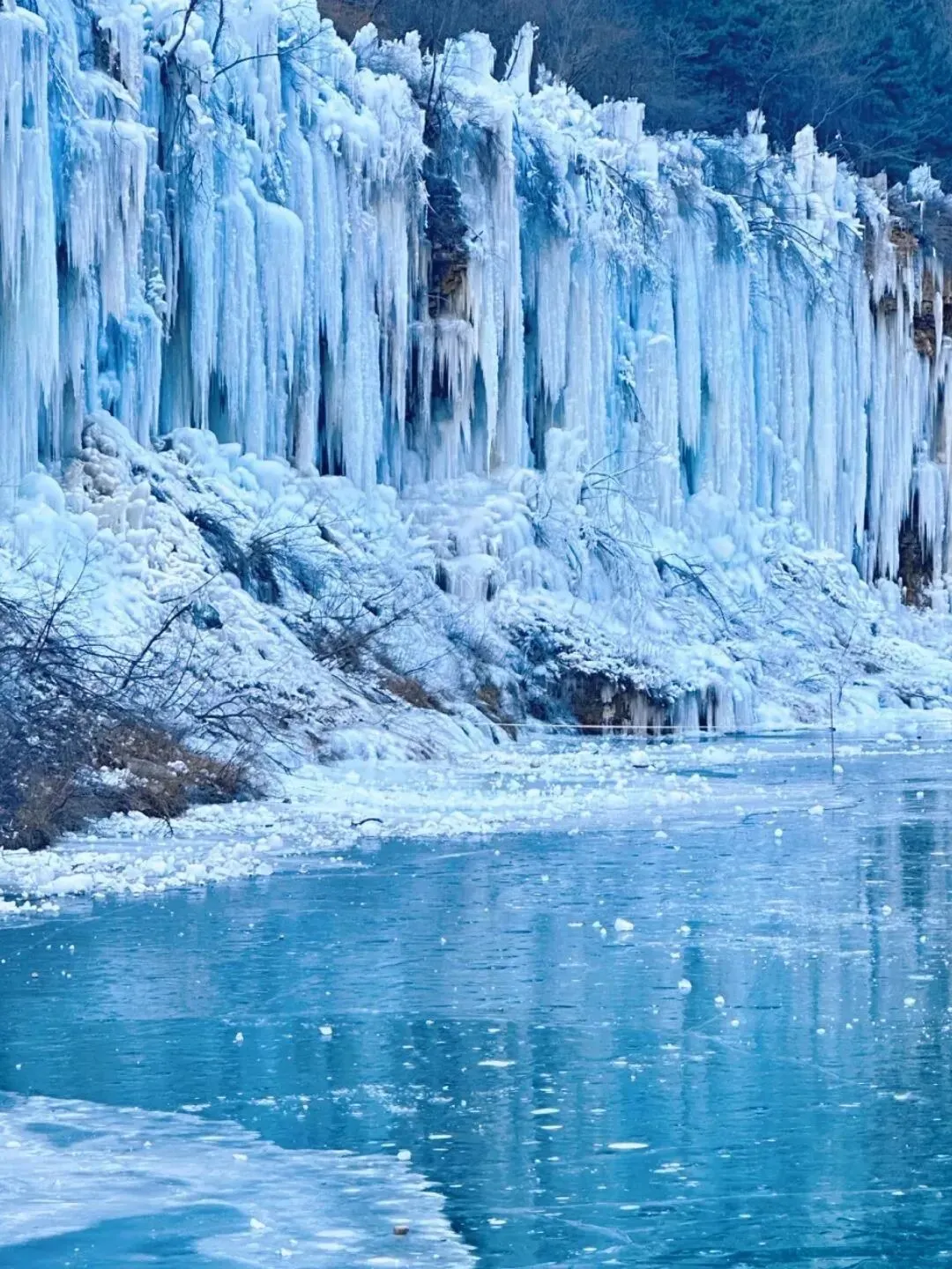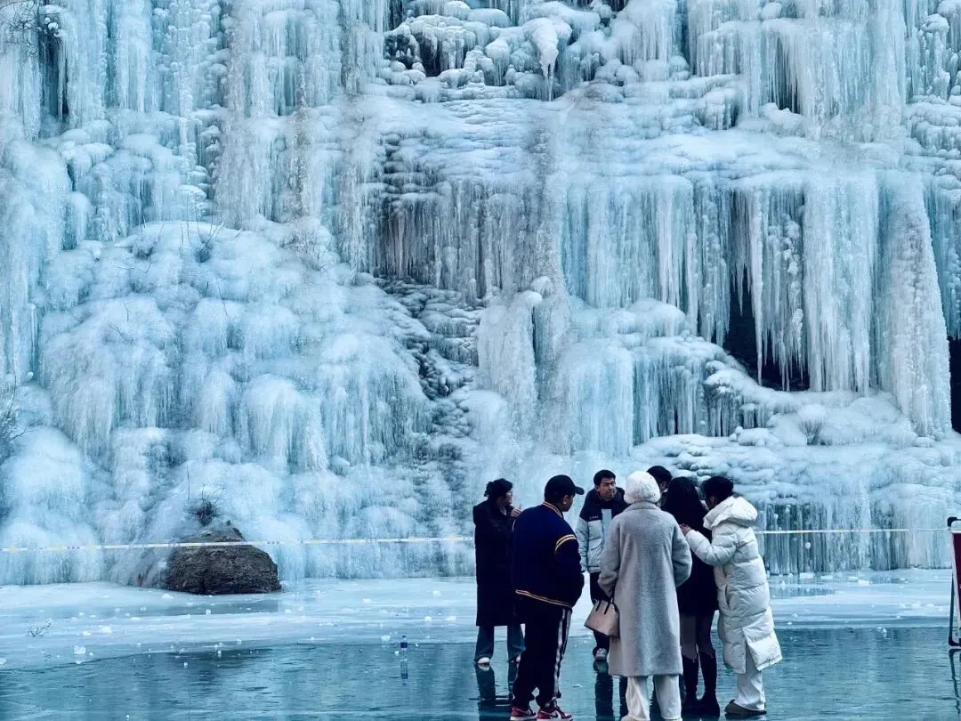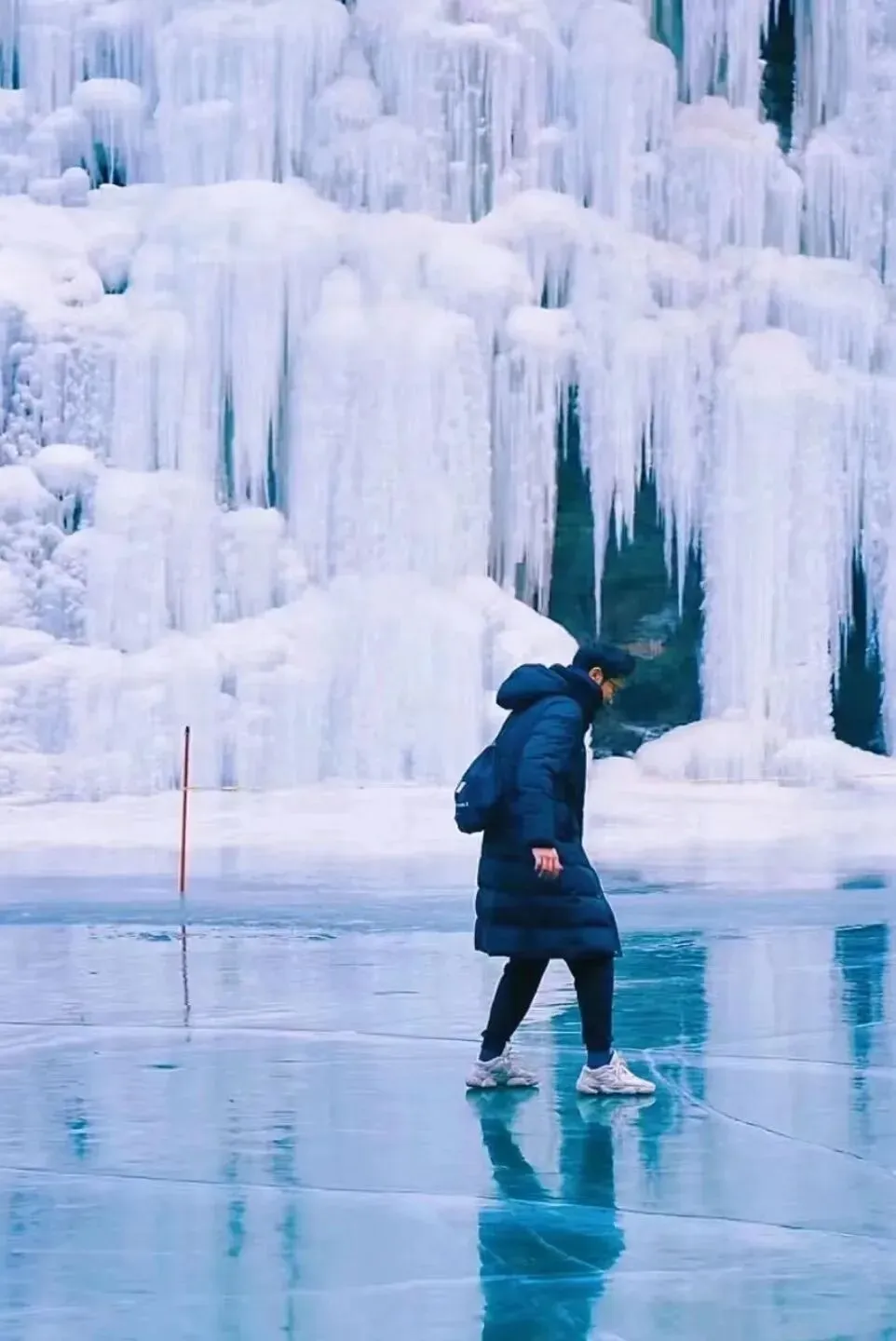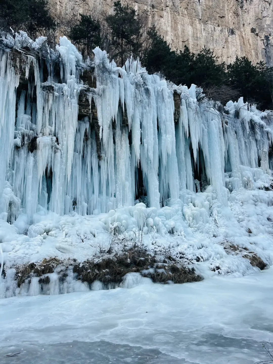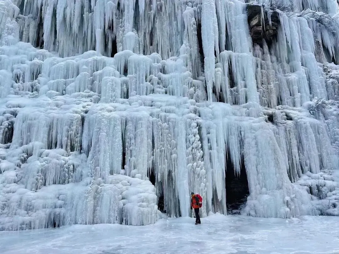 岩壁上挂满了晶莹剔透的冰挂、冰凌,如同冰雪童话世界