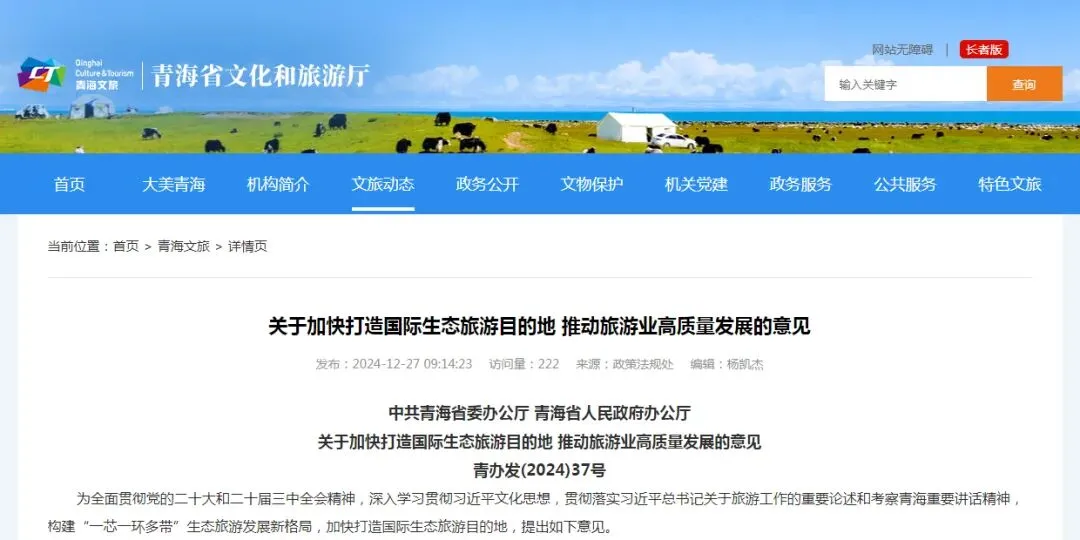 2024年12月27日,青海省文化和旅游厅官方网站发布了中共青海省委办公厅、青海省人民政府办公厅《关于加快打造国际生态旅游目的地 推动旅游业高质量发展的意见》,旨在构建“一芯一环多带”生态旅游发展新格局,加快打造国际生态旅游目的地。
