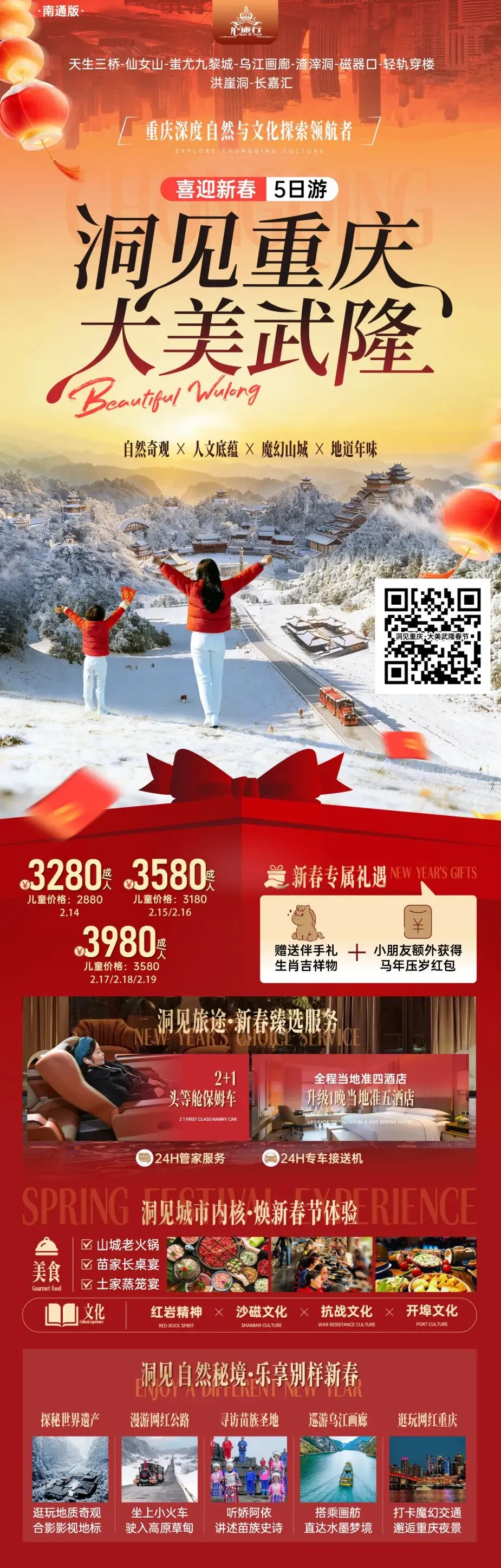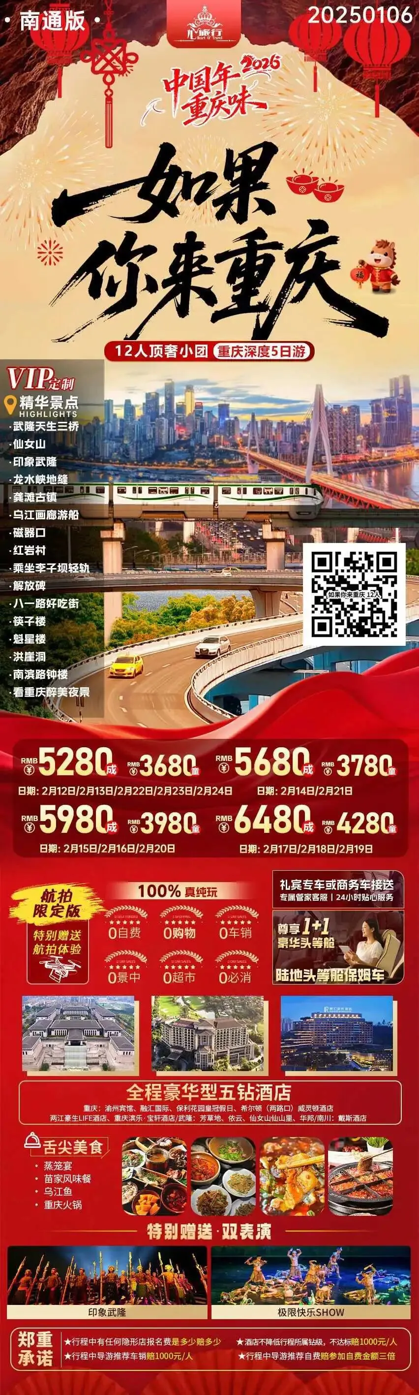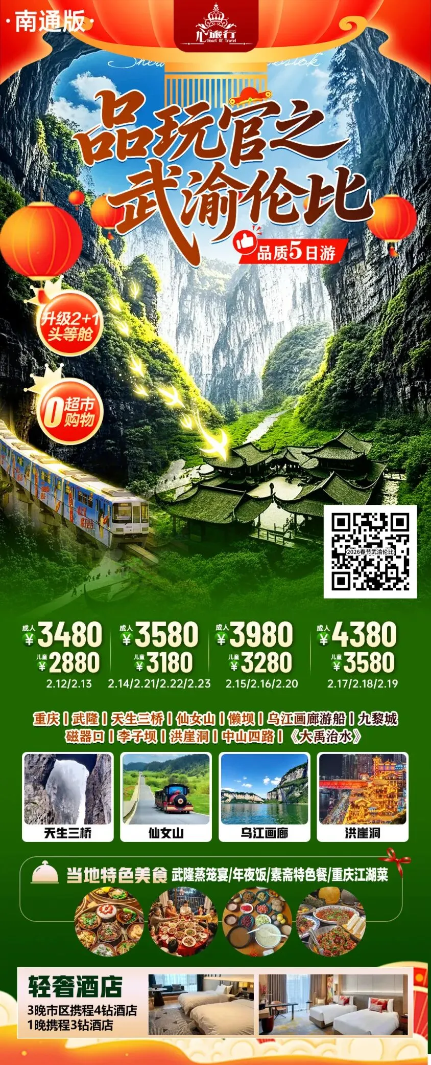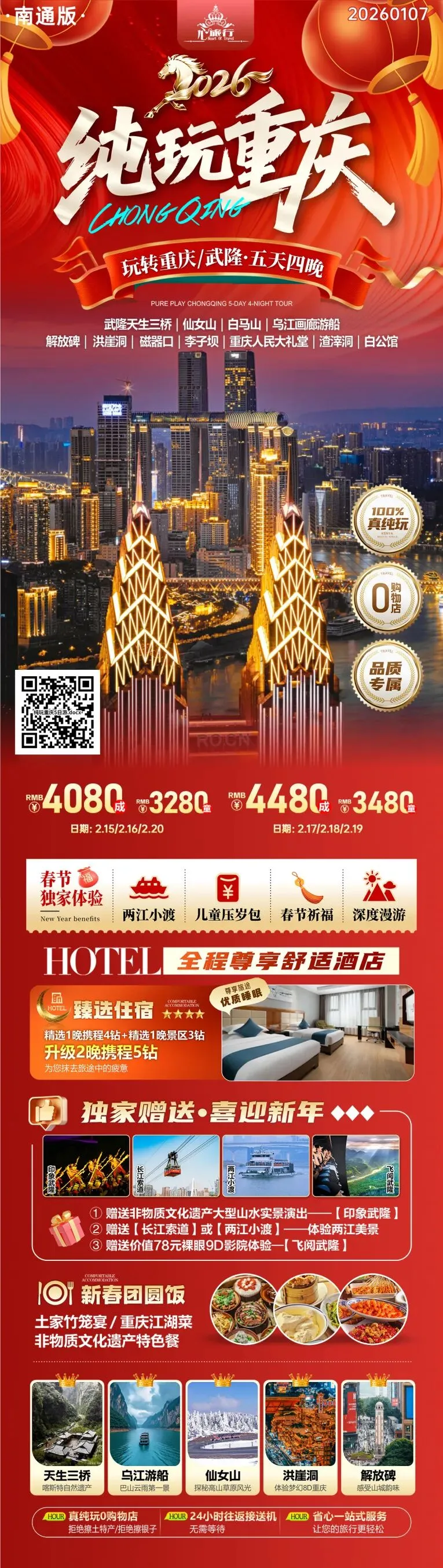 重庆爆款销冠线路,指定1+1车,指定3晚5钻酒店+武隆2024年城际酒店,12-16人纯玩小包团!