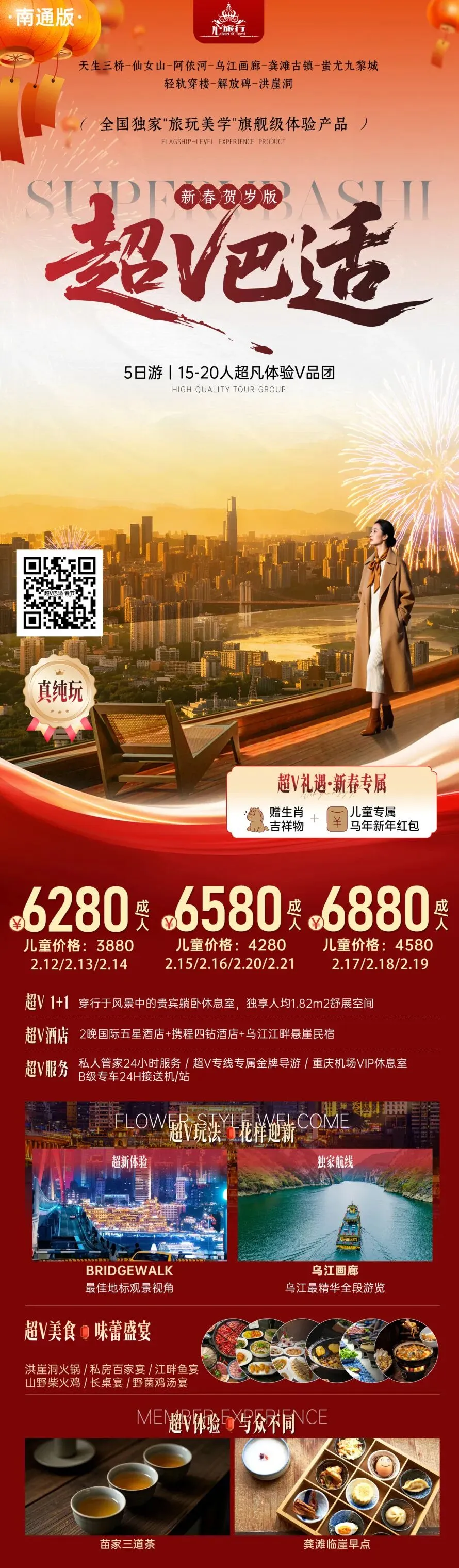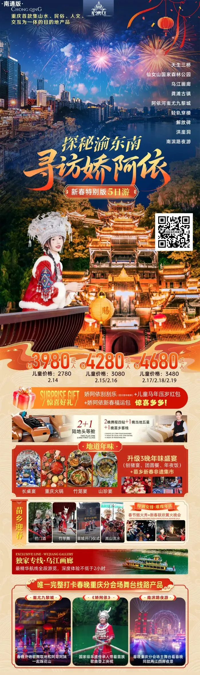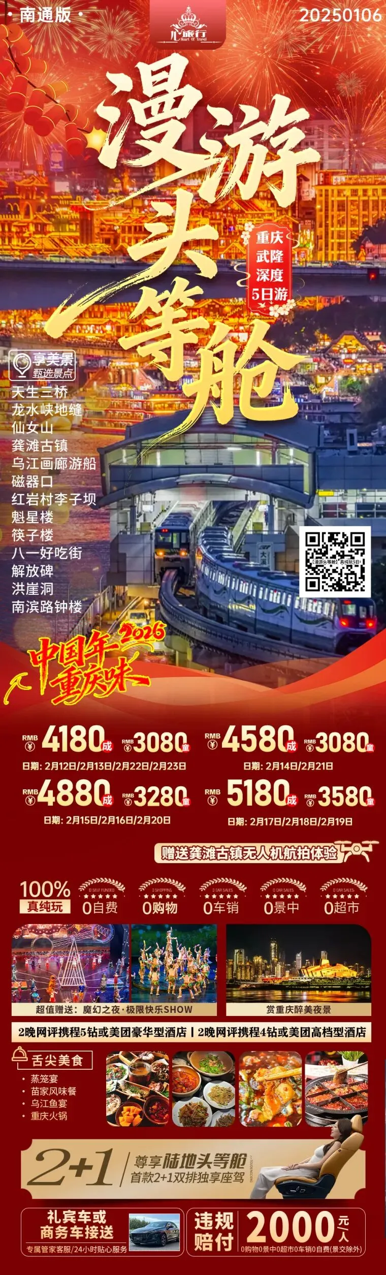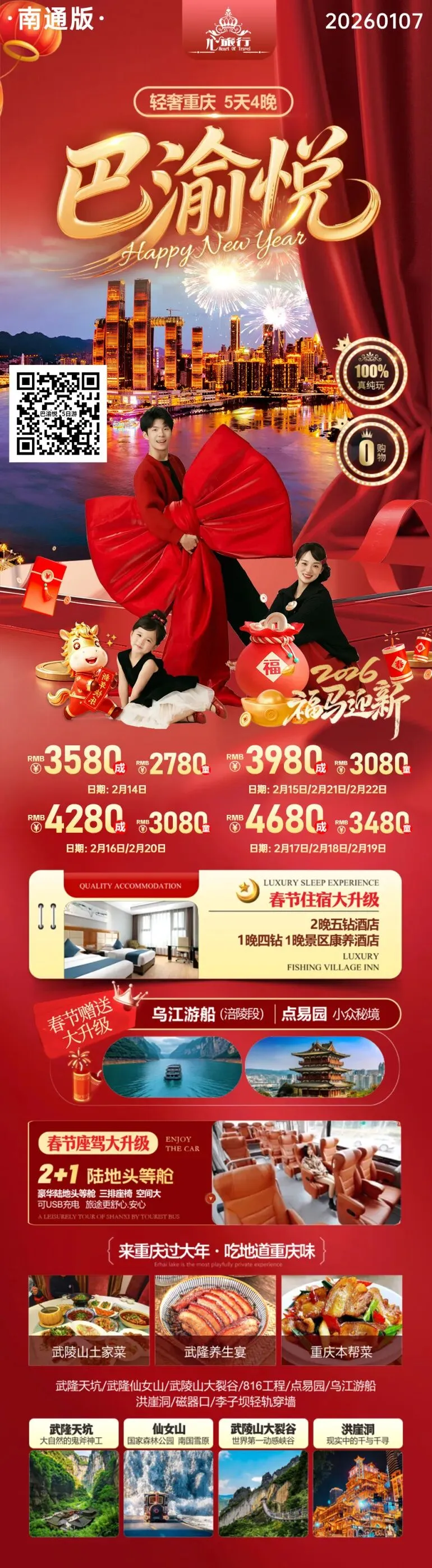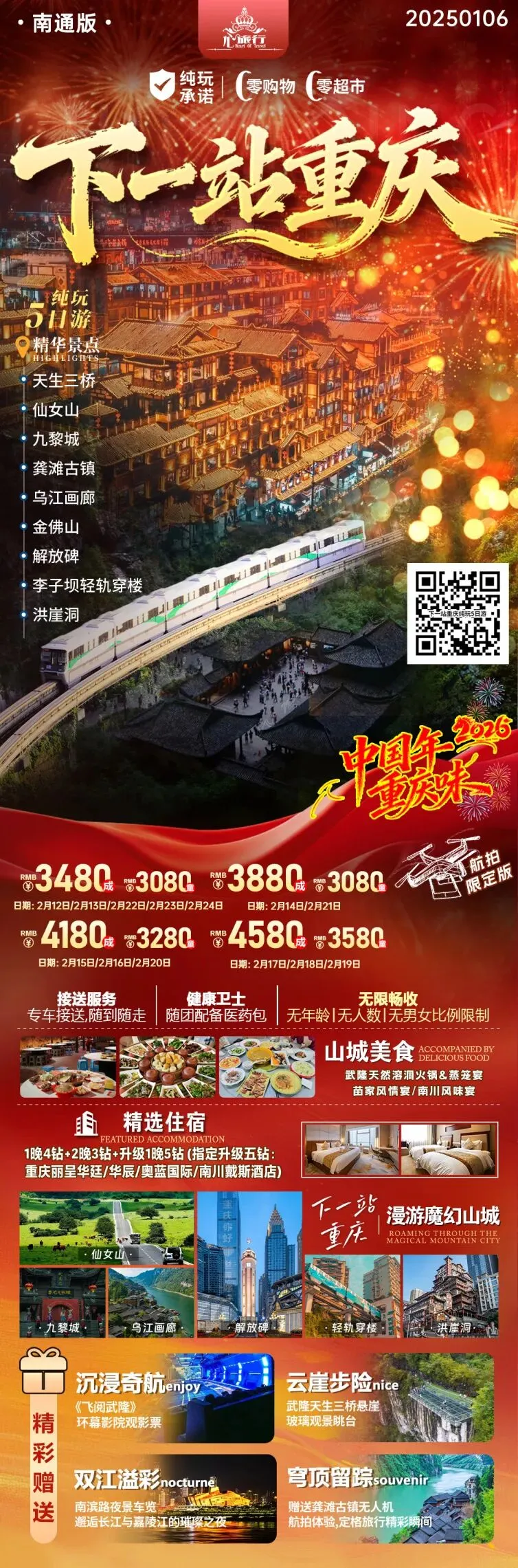重庆爆款销冠线路,指定1+1车,指定3晚5钻酒店+武隆2024年城际酒店,12-16人纯玩小包团!