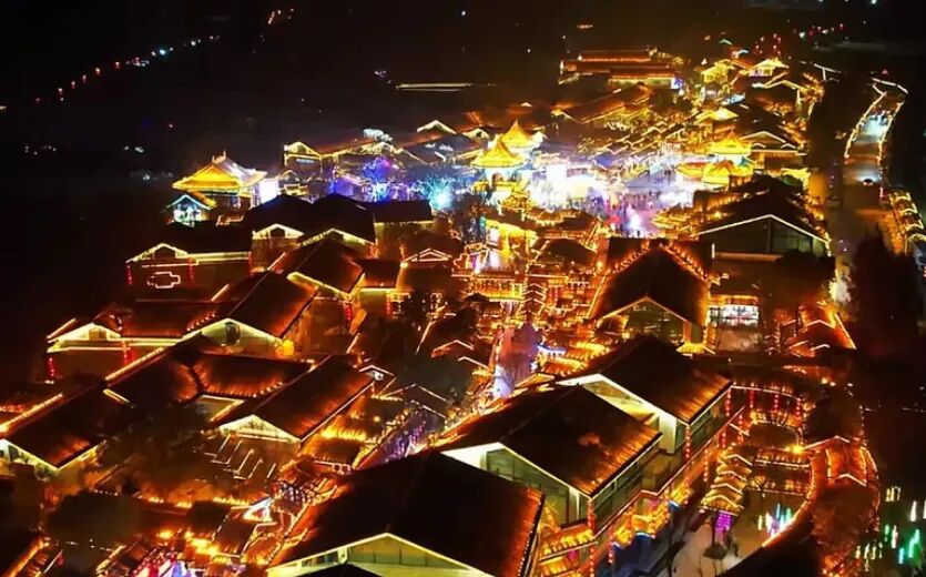 晚上七点半,当第一盏灯笼亮起,整个巷子仿佛被施了魔法。仿古街巷瞬间化作现实版的"千与千寻",霓虹与古建交织出一种独特的赛博朋克古风。密密麻麻的红灯笼从头顶倾泻而下,在石板路上投下斑驳光影。篝火台在广场中央熊熊燃烧,游客围坐取暖,气氛热烈。