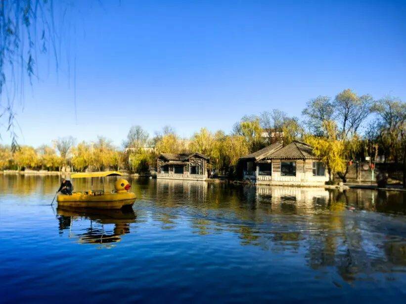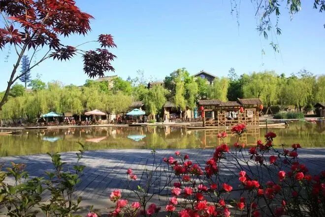 沿着全长7公里的河道漫步,500处水景节点在脚下流淌。仿古建筑群错落有致,黄泥青砖配上金黄的茅草屋顶,关中民居的质朴与江南水乡的灵秀在这里奇妙融合。游船码头上,竹筏静静停泊(30元/人),等待着载游客穿行于水巷之间。