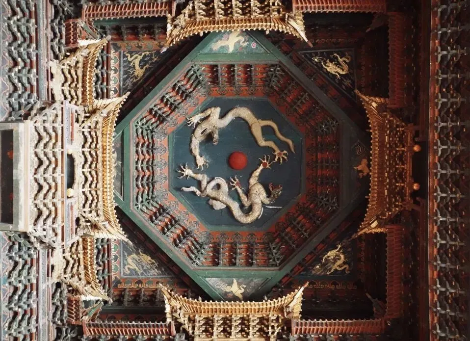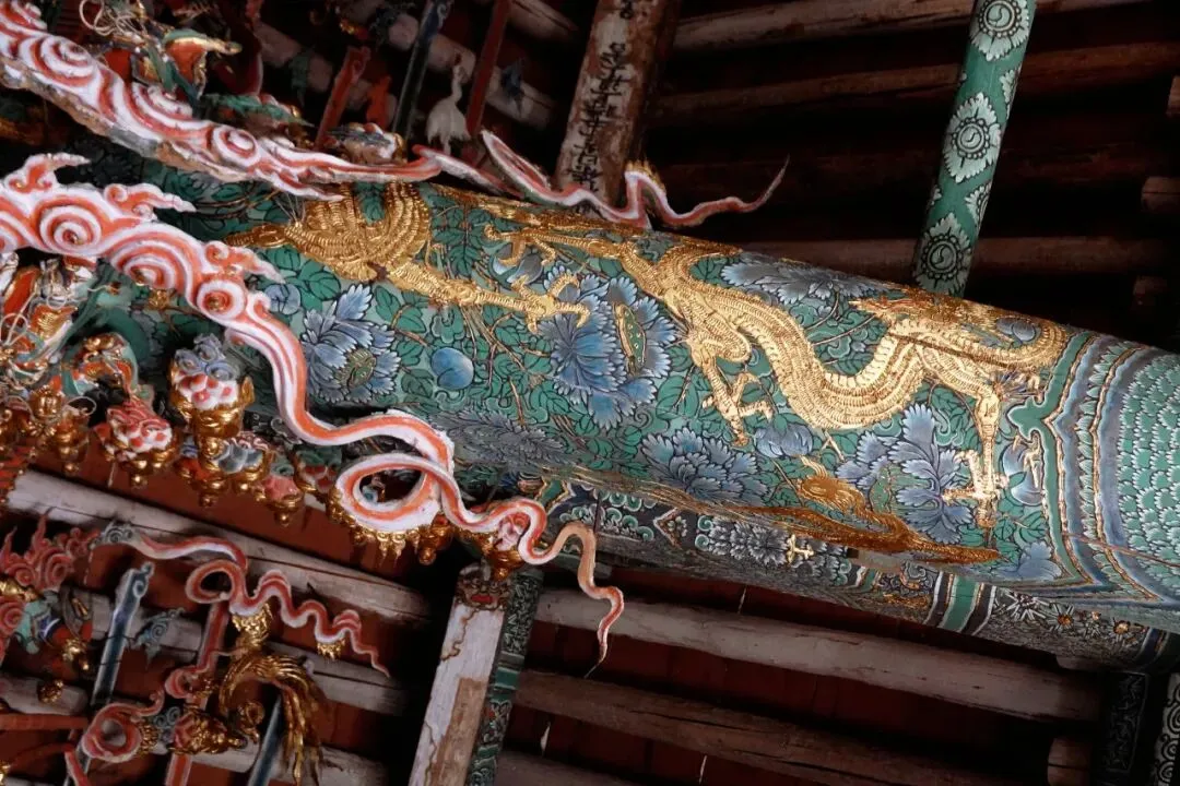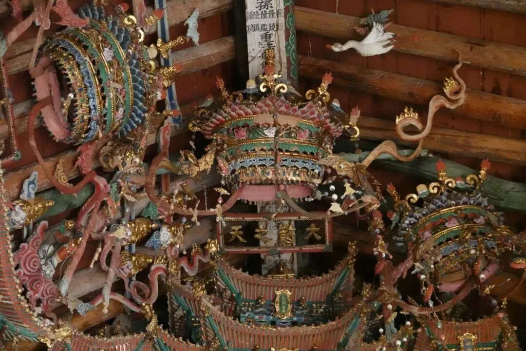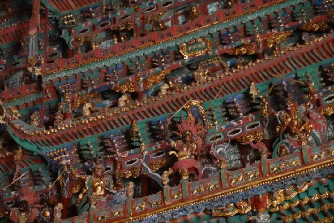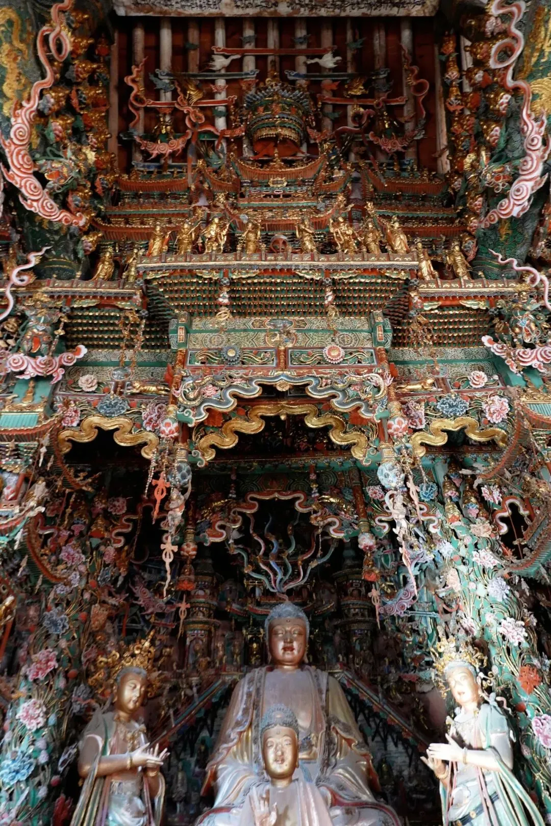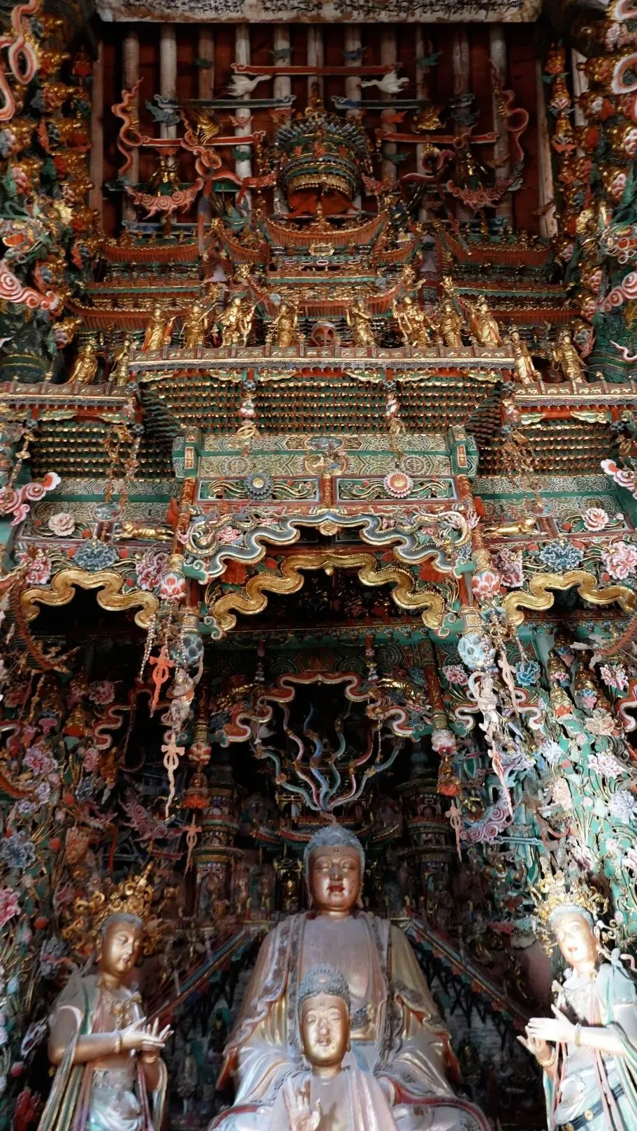 当然民间艺术家天高皇帝远的,胆子也贼大,沥粉贴金的龙凤和玺,皇室专用的最高等级也用在了横梁之上。佛像的铺排“乱来”,墙绘彩饰拉满,弟子泥塑的生活感,这样不符合“程式”的小西天,反而成为悬塑艺术的瑰宝。