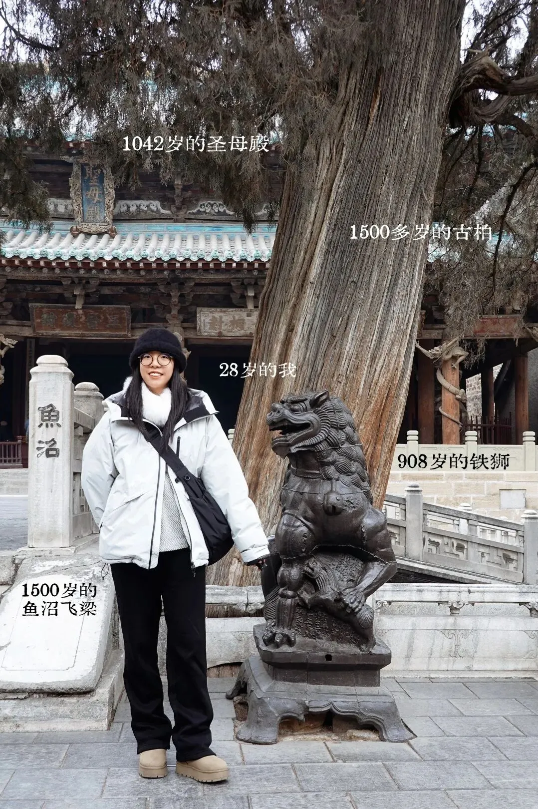 但晋祠的古朴宁静,李世民的唐碑触手可及,祭祀的献殿人来人往,3000多年的古柏树根处被人摸的泛光,圣母殿里藏着嬉笑怒骂生动逼真,上手触摸难老泉的泉水亦是温凉圆融的触感……站在鱼沼飞梁的一侧,人类还是太年轻了。