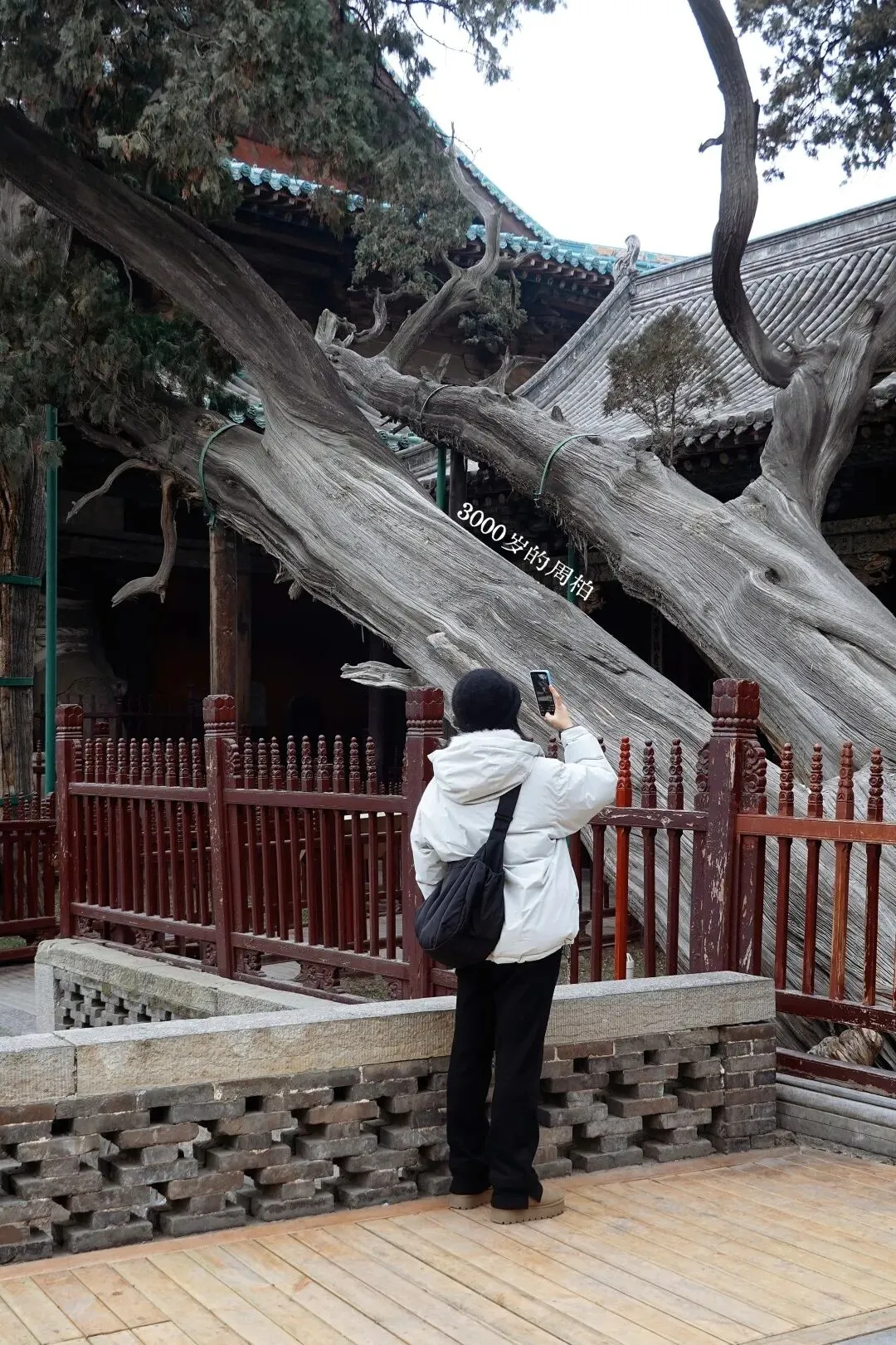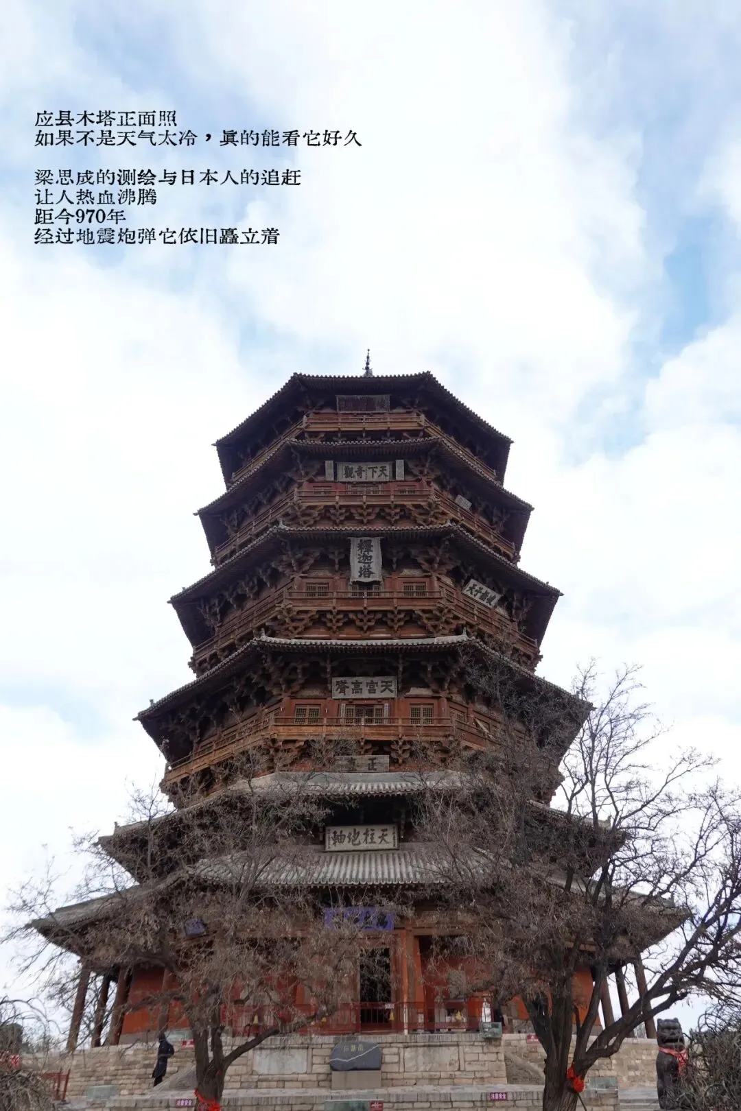 很推荐大家先去看清华出品的《千年一塔看应县》,跟着镜头一起登塔,看它塔身上的弹孔,看每一层的造像,看最顶上梁思成是如何爬上去测绘的……如果不是太冷,真的能坐着观望它很久。能早去就早去吧,未来如果要进行修复工程,脚手架会把一切美好圈起来。