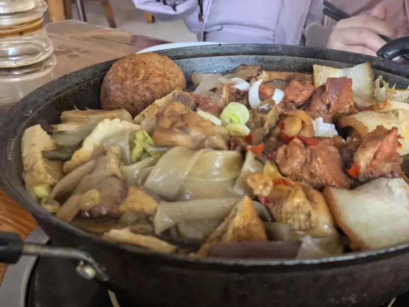 讲解完给我们一个小时的自由活动时间,非常的充裕,佛光寺结束后就回到豆村吃午饭,由于我们人不多,韩导带我们去吃了五台烩菜,和地锅鸡差不多的吃法,先吃菜再下面,菜有当地的豆腐丸子,面是现做的揪面片,小朋友都连干了三碗,味道真的是不错子!