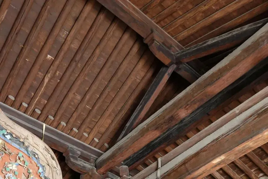 佛光寺的斗拱也和前几天看到的不一样,没有普拍枋,栌斗直接和柱子相连,硕大的斗拱使之出檐深远,站在一角抬头看,其檐与柱子的长度等长。最关键的是使用了大叉手,即横梁之间呈三角形中间没有垂直支撑的木头,与辽宋之后的建筑有所差别。