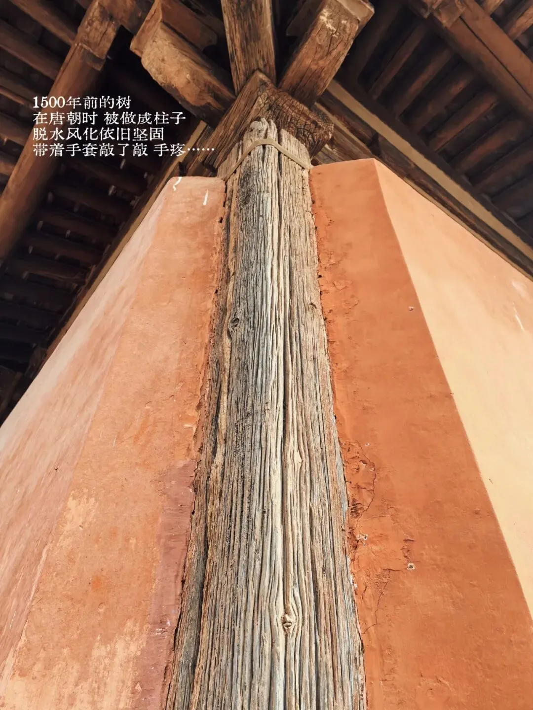 最古早的一根方形柱子,殿四角其他的柱子都有修补,只有它还是当时的模样,风化脱水后非常的坚固,导游让我们敲一敲说像敲门板,我只能说敲的手疼……