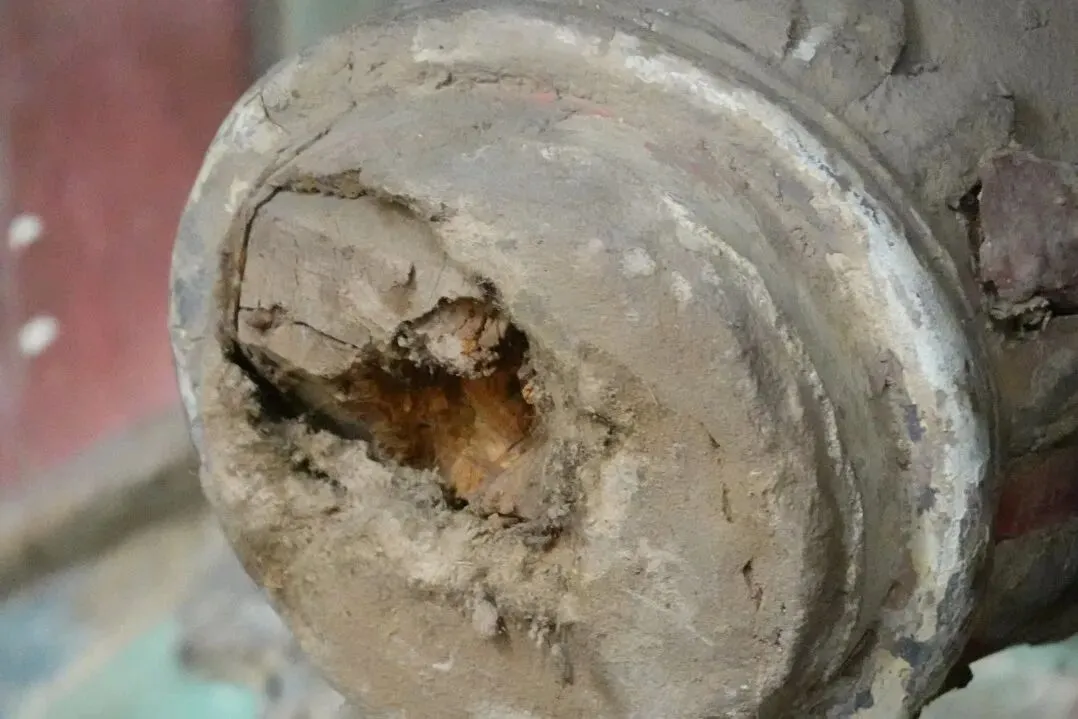 从一处断臂中,可以看的这些彩塑全都是木心泥胎。