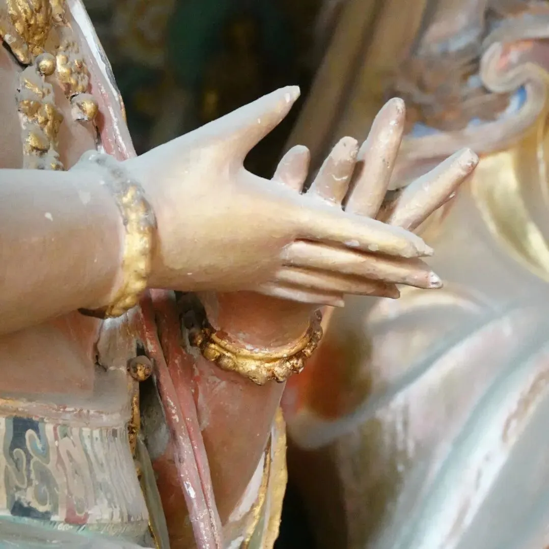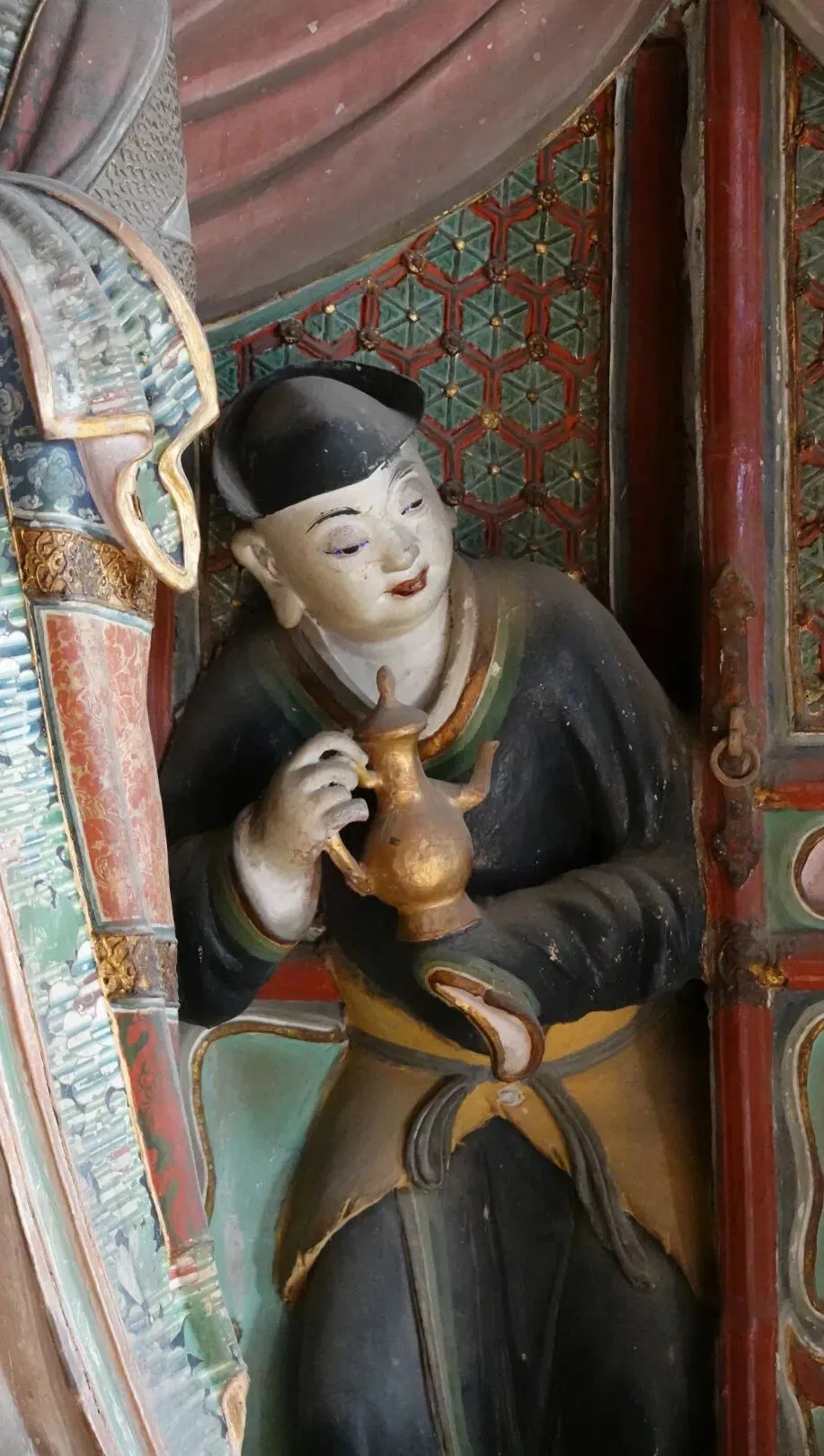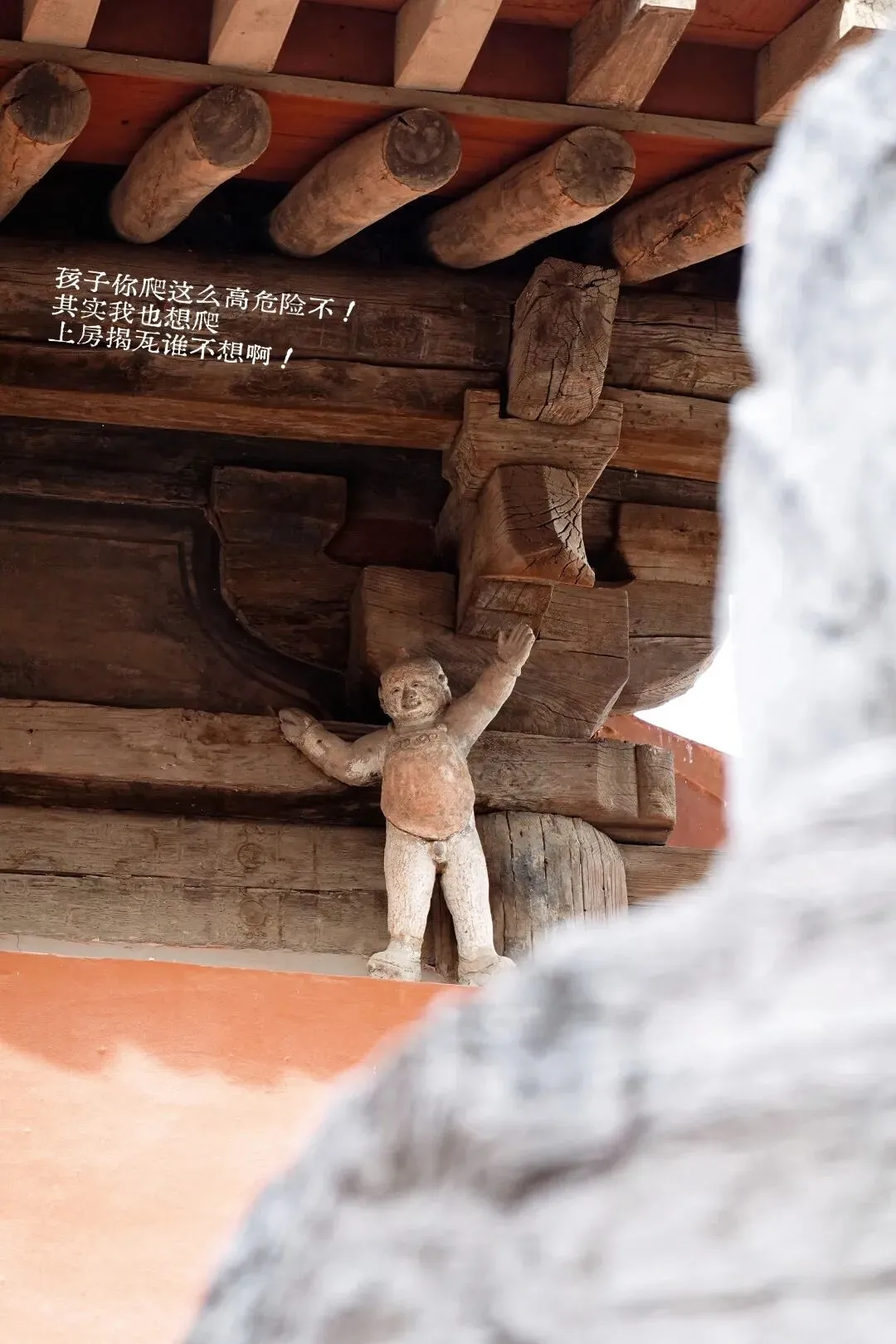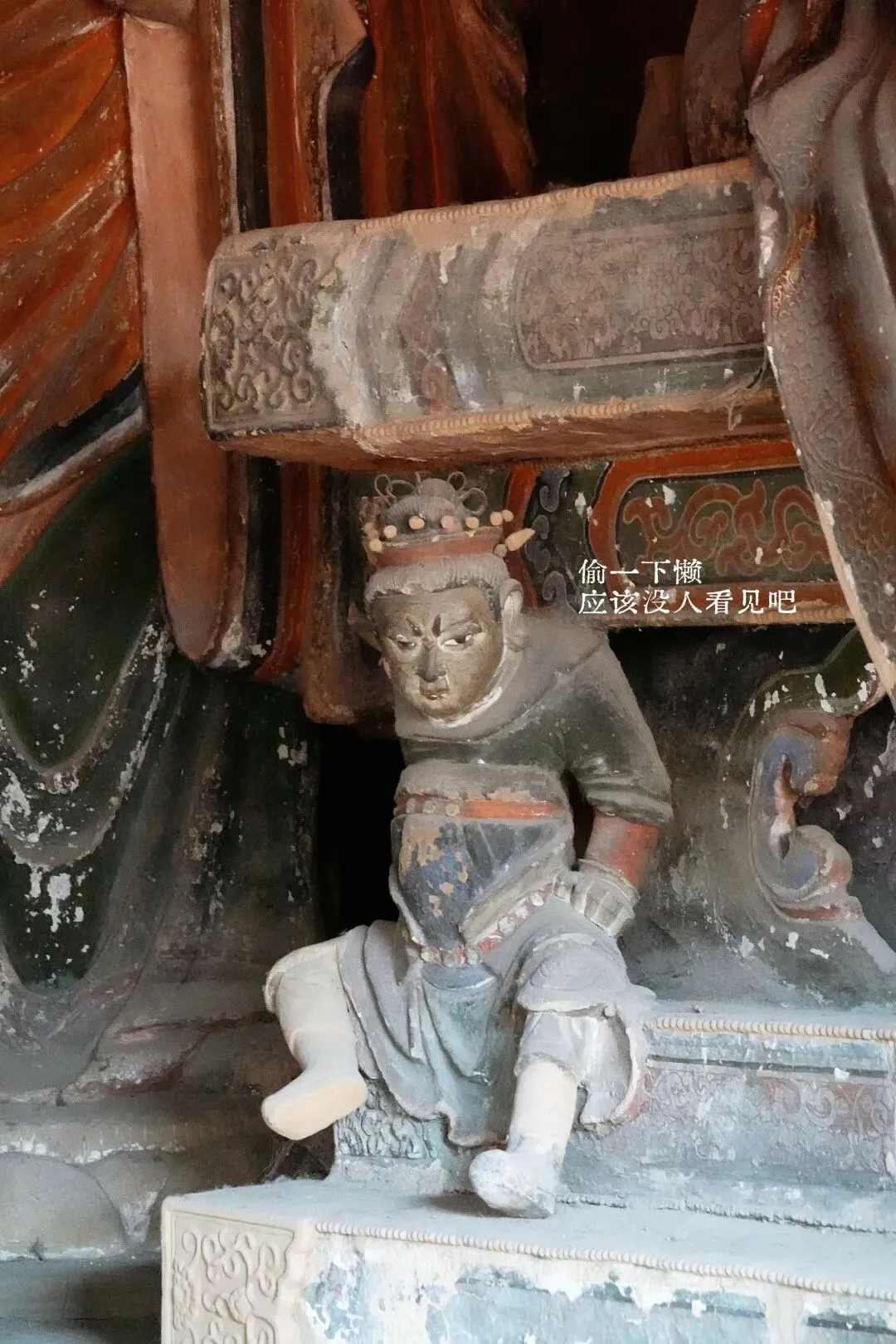 元代的塑像不知道是不是少数民族的风格,更生活化更刚健圆润,女性菩萨的发型更是绑了小辫子盘了起来,老者的手上和脸上的皱纹清晰可见,罗汉圆圆的眼睛特别的旺仔,拖着莲花座的小人好几个在偷懒的,屋檐上还有可爱的小人……