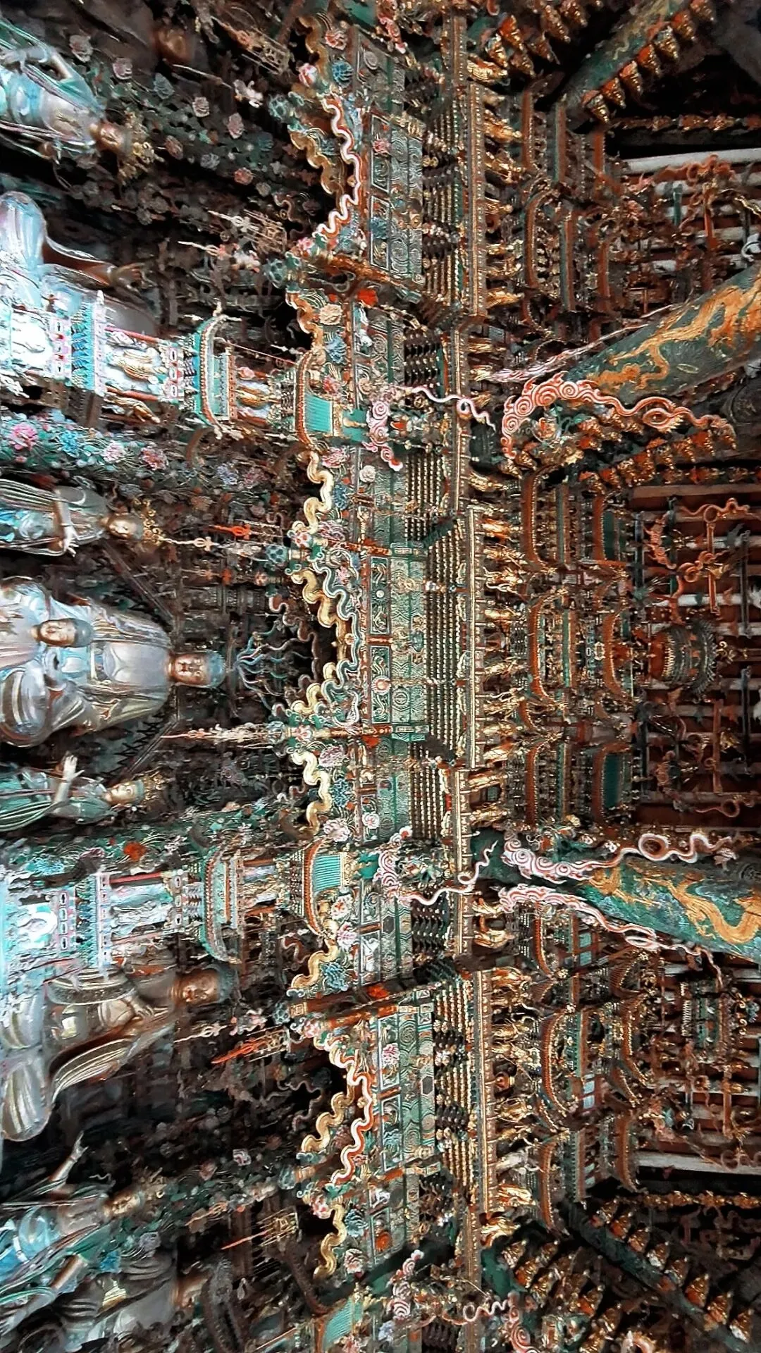 船型的小西天,坐西朝东,人们不断的走上台阶也是算是走一走西天取经的道路。最后走到大雄宝殿,五个世界的佛祖菩萨一起向你涌来的那种视觉冲击感,真的是一步跨越到里世界的味道。