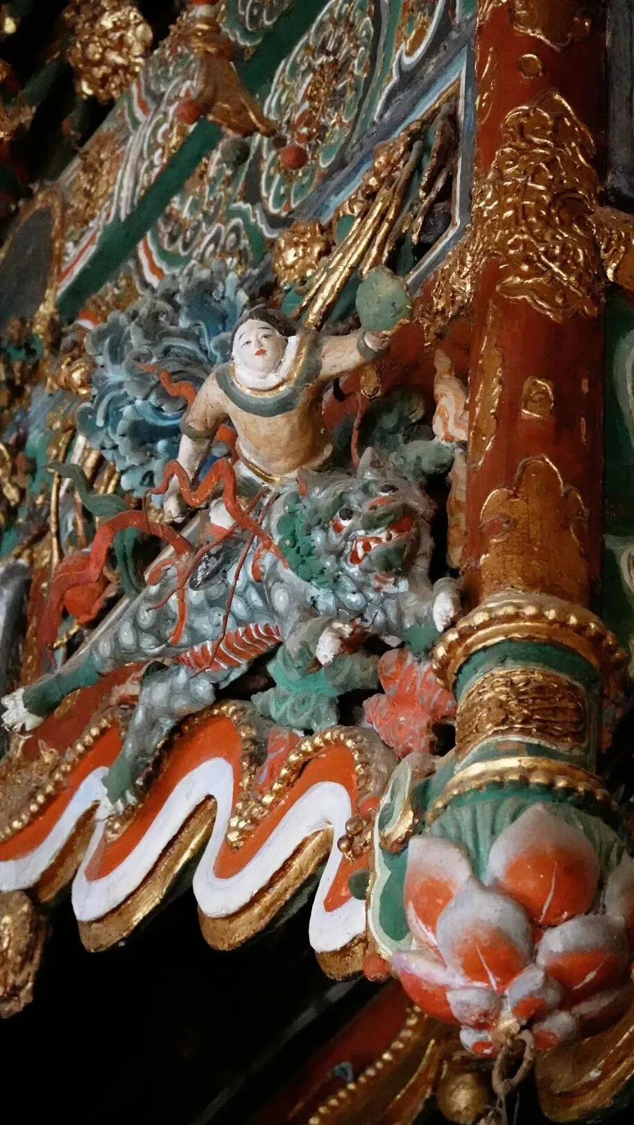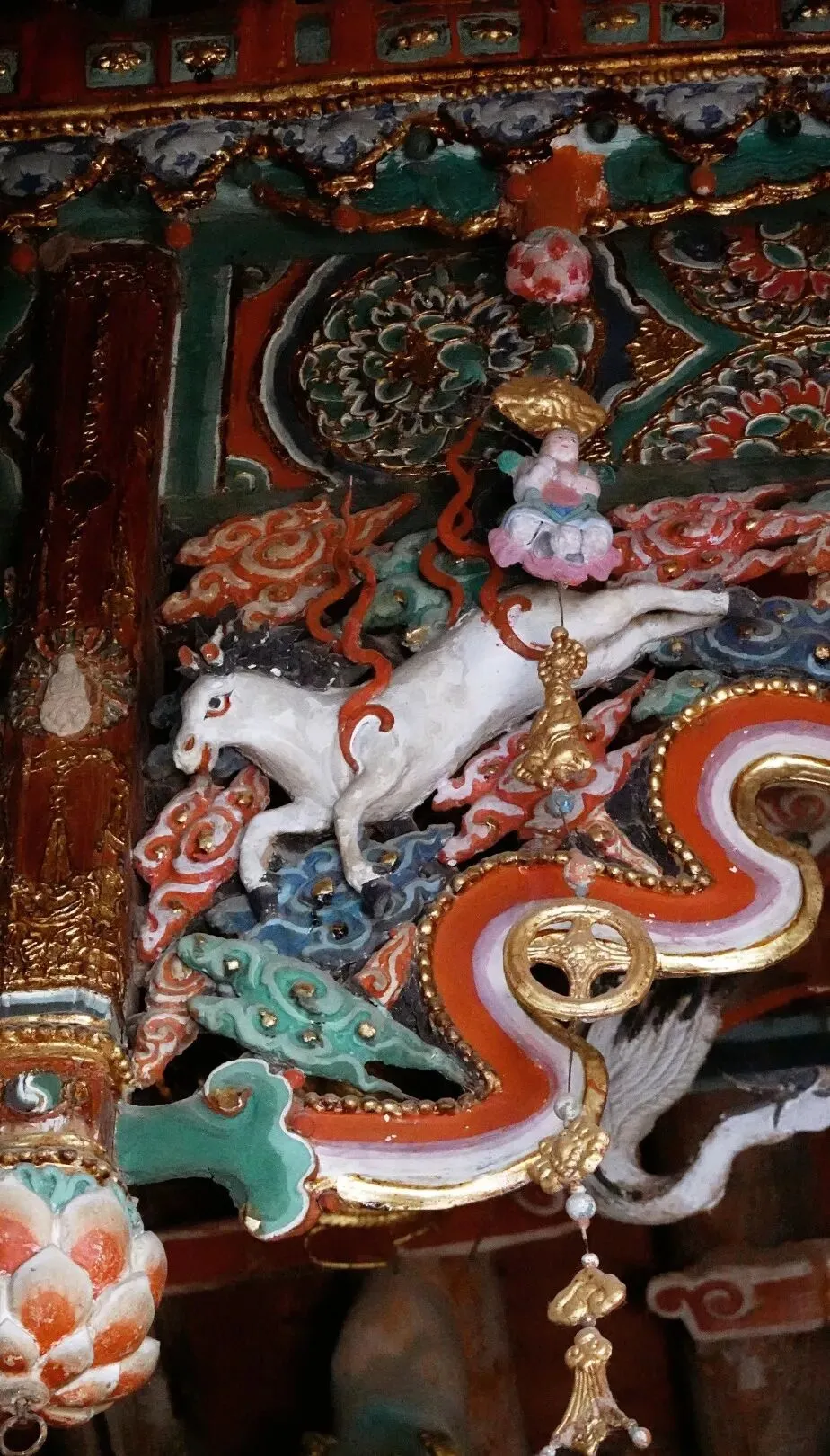 中间这个小沙弥一看就是水壶太烫,用袖子垫着壶底呢!满墙泥塑除了很多不同龙的形态,因为今年马年么,还找了好多匹活泼的马儿出来。还有这大金镯子,真的羡慕坏了。