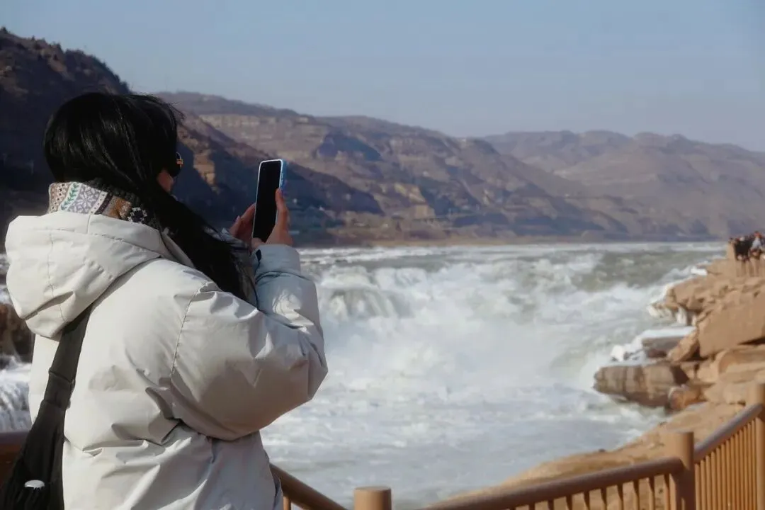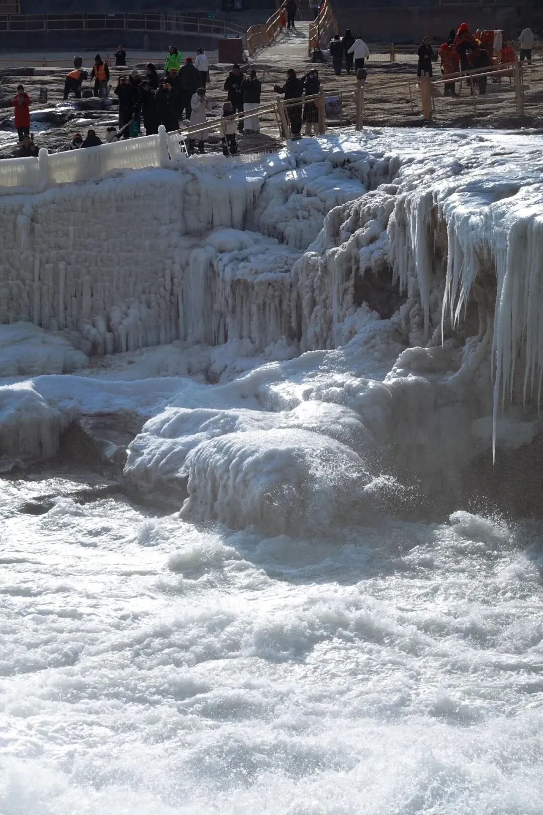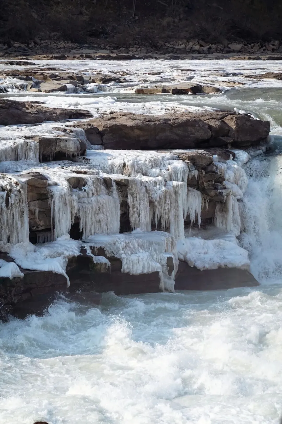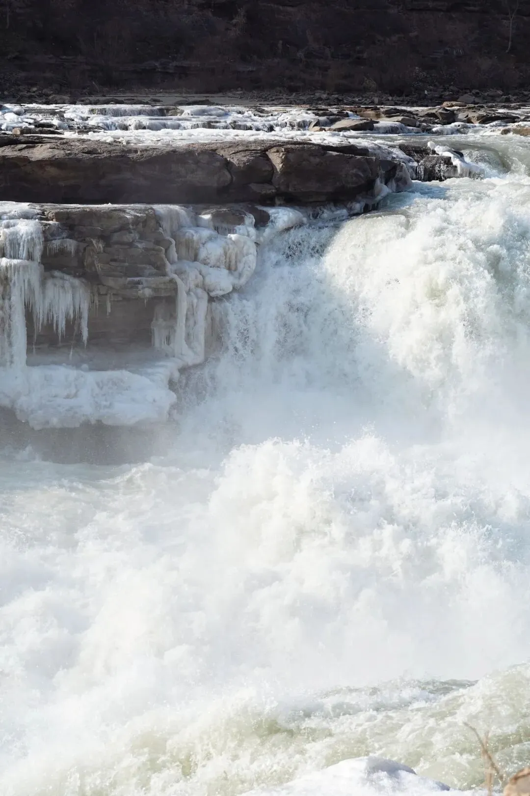 冬季的壶口瀑布水流量不大,颜色也不是那种刻板印象中很黄土的颜色,反而水花扬起处洁白而清澈,只有在冰挂上看得出一些黄土高原的痕迹。