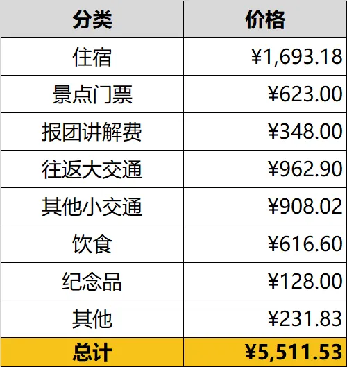 最后附上本次行程的价格汇总,如果是两个人一起,这个行程人均4000出头就够~
