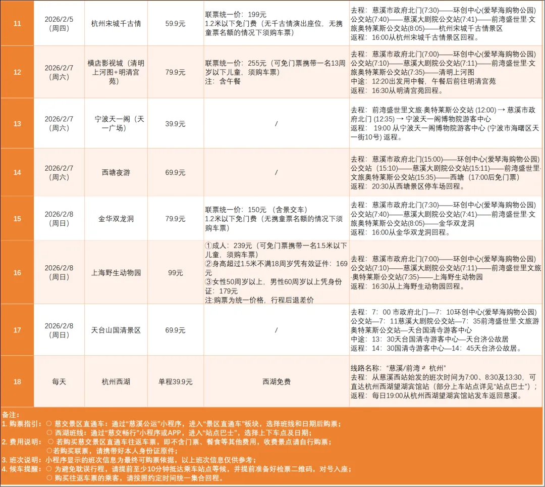 2026/2/8(周日):慈溪、前湾直达金华双龙洞、上海野生动物园、天台山国清景区;