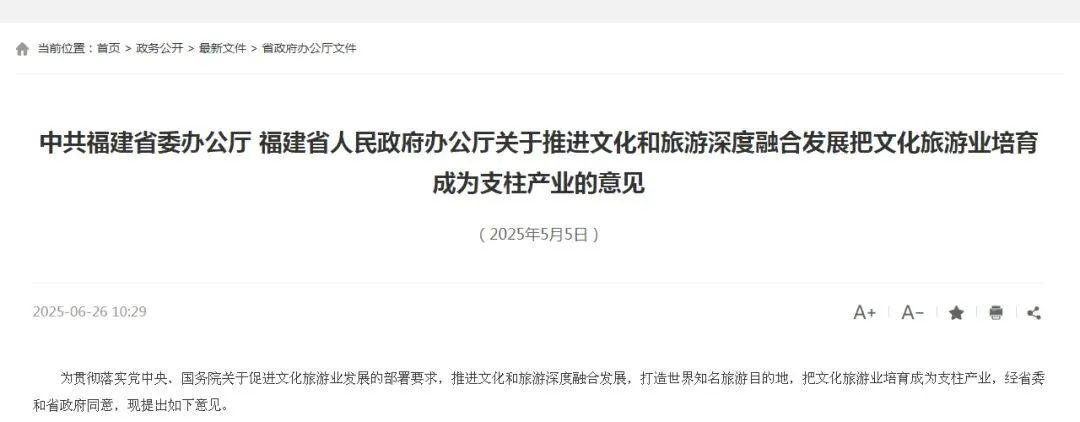 6月26日,福建省人民政府门户网站发布了《中共福建省委办公厅 福建省人民政府办公厅关于推进文化和旅游深度融合发展把文化旅游业培育成为支柱产业的意见》。《意见》的提出,旨在推进文化和旅游深度融合发展,打造世界知名旅游目的地,把文化旅游业培育成为支柱产业。