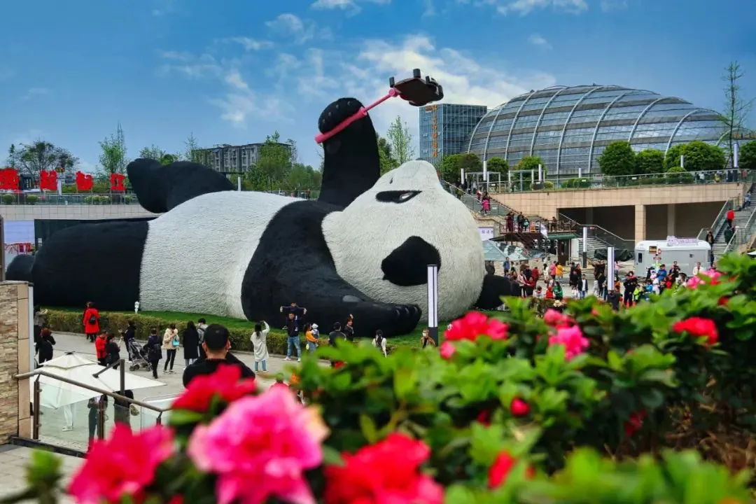 自拍熊猫 位于仰天窝广场的 , “自拍熊猫”作为都江堰新地标, 由著名设计师费洛伦泰因·霍夫曼设计, 长26米,宽11米,高12米,重达130吨, 神态怡然、悠闲自在, 和他合影,一定萌翻你朋友圈。