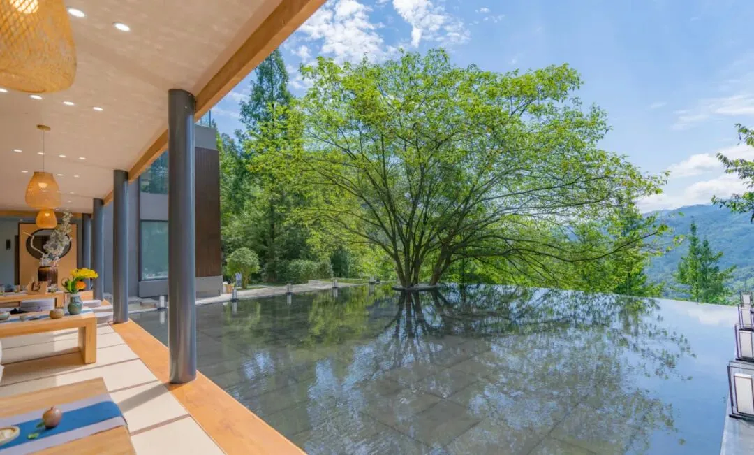 卿宿青城 民宿室外环境由专业团队设计打造,院内铺设净水面,山间利用现有条件改造溪水池,动静结合,绿植与鲜花相结合,溪水与山石成互动,并依据现有地貌打造观竹平台,木质栈道,感受融入自然,靠山而居的乐趣。