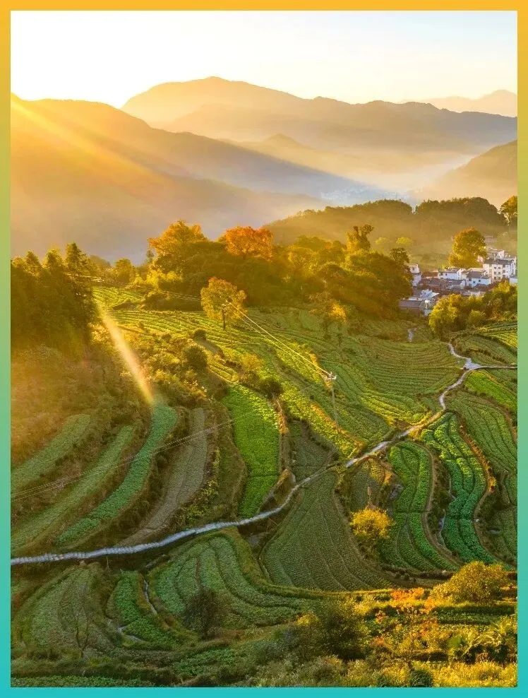 漫山遍野。梯田层叠。黛瓦白墙的徽派古村落星星点点散落其间...再加上晨雾缭绕的时候——我的天,简直就是现实版的《千里江山图》和莫奈干草堆的结合体!