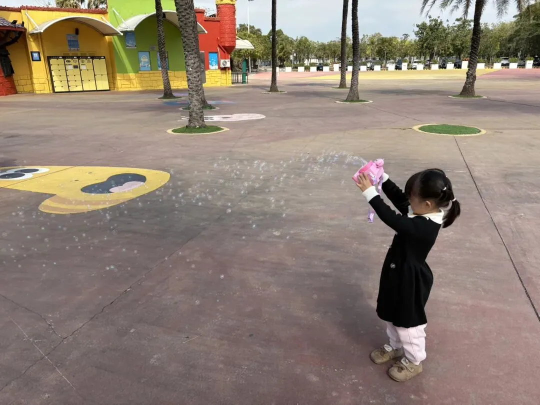 吃完饭上车,很快就到海洋王国门口了。下了大巴车,背上你的书包,走到门口等待发门票。在门口的时候看到泡泡机你说想买,问了下价格好贵,没给你买。拿到门票,进入海洋王国,拍了张照片又看到一个泡泡机的摊位,你说想买,你妈妈给你买了一个79块钱,我是不同意的(太贵了),不过后来看你玩得开心,一路上不停地吹泡泡,感觉还是挺好的,就是贵得离谱。