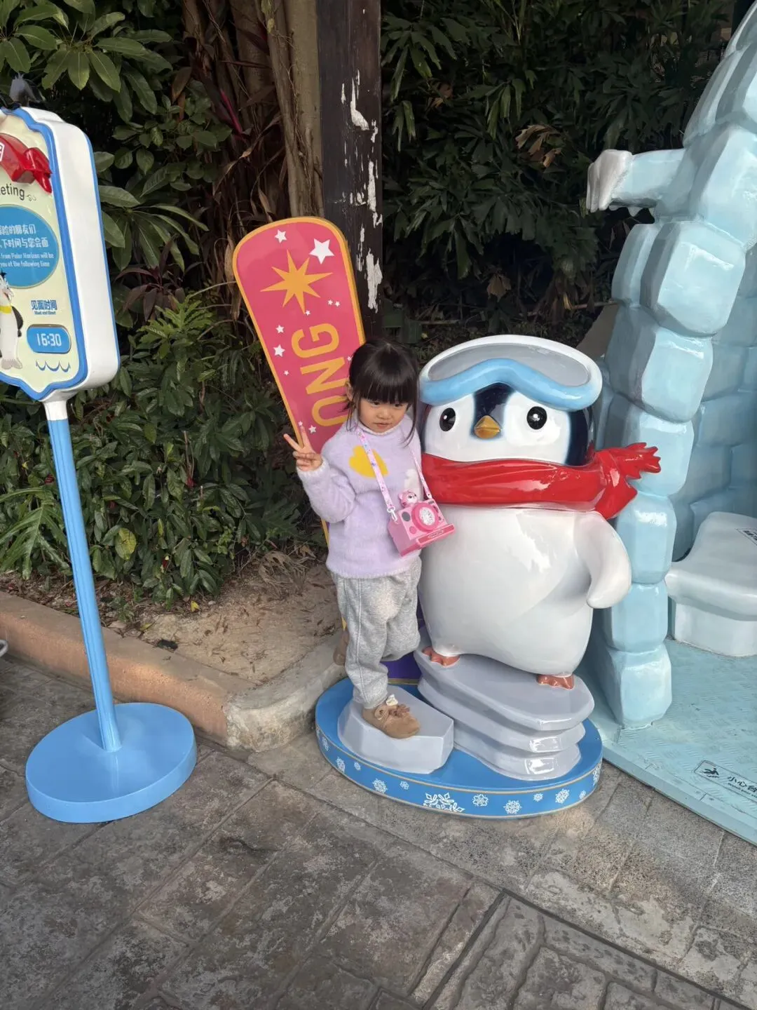 看完这些来到企鹅馆,看到了很多很多的企鹅,还有戴着手链的企鹅,场馆里面还有水下走廊,可以看到企鹅在上面游泳,你第一次看到这些非常的惊讶和喜欢,大呼一声。然后进入北极熊馆看到了北极狐,北极狼,北极熊,你问我这是哪里,我说是北极熊的家,你说不对,这是北极熊的山洞。我问熊大的山洞也是这样的吗?你说不是,熊大的山洞是棕色的。看完北极熊来到白鲸馆,在白鲸馆表演马上要开始的前,你困得不行,靠着我睡着了,等表演完了你都还没起来,抱着你走出了场馆。出来后没多久就醒来了,吃了点饼干,继续往前走,进入海底互动船,你妈妈跟着我们一起进入,走到要上船的时候问工作人员是否可以上船,被告知不行,真可惜。在船上我们看到了很多不同的鱼和壳类动物(部分是假的),和不同的海洋植物(假),差不多到出口的那段,在隧道的顶部有一条鲨鱼(假)冲出来,勇敢的你肯定是不害怕的,在这期间你说下次还要来这里玩,也要带上小哥哥一起来这里玩。看完这来到了鲸鲨馆,这里有很多的玻璃墙,玻璃墙里面是各种各样的鱼,还有水母等其他海洋生物。但是你并不喜欢这个场馆里面的东西,都到最大的玻璃墙的时候,你说不看了,要出去了。从入玩到现在差不多是17点20分了,路过一个完锤香蕉的摊子,你说想玩,我们看了下,还玩不了。作罢了。按着路线走,来到雨林升降塔,量了下身高可以玩,进入里面排队。排队的时候发了视频给爷爷,简单地说了几句话就挂掉了。在等待的时候你再数吊塔的升降次数,一共是上下6次,合计12。由于你妈妈说坐靠她那边的塔位,导致多等了一轮。开心地做完升降塔,夜幕降临,就去吃晚餐吧,到雨林餐厅,点了两份肥牛河粉,你说真好吃。吃完晚餐是要去海豚馆的,但是来到已经关门闭馆了,兜兜转转到5D影视体验馆,排队领了眼镜入场,可惜,你妈妈又参加。入场来到影院门前,看了一段片头,片头里面问,各位英雄准备好了吗?你大声回答:准备好了。(前面还有几个问题也是大声回答,记不清楚是什么问题了)。开门入场,戴上眼镜开始体验,3D场景的动画片+会动的椅子,没一会有一些比较凶狠的动物画面,现场又是喷气又是晃动的,你说害怕想走了,我鼓励了一下你,继续看完,片尾结束,主人公坐上 鹦鹉飞机和企鹅告别,随后从荧幕上方飞出,你大声地哇了一下,离开场馆的时候还一个劲地问,为什么他们从天上飞出来了。体验完这个,在出来的路上我让你告诉妈妈看了什么,在路上你说下次还要来,还要带上小哥哥一起来。看完这个差不多就晚上7点半了,跟着人群去等待烟花秀。主持人问今天玩得开心吗?你大声回答到开心。主持人问到准备好了吗?你大声回答准备好了。前面的人回头看了下我们,有点惊讶的样子。实际来到20点,开始了烟花秀,烟花秀不单单有烟花,还有水上飞人,还有火圈,期间你嗷嗷大叫,看出来是真的开心,你老爹的肩膀都差点给你坐塌了。看完烟花秀,大家都开始离场了,在出去的途中,又给你的泡泡机加了一次泡泡水。