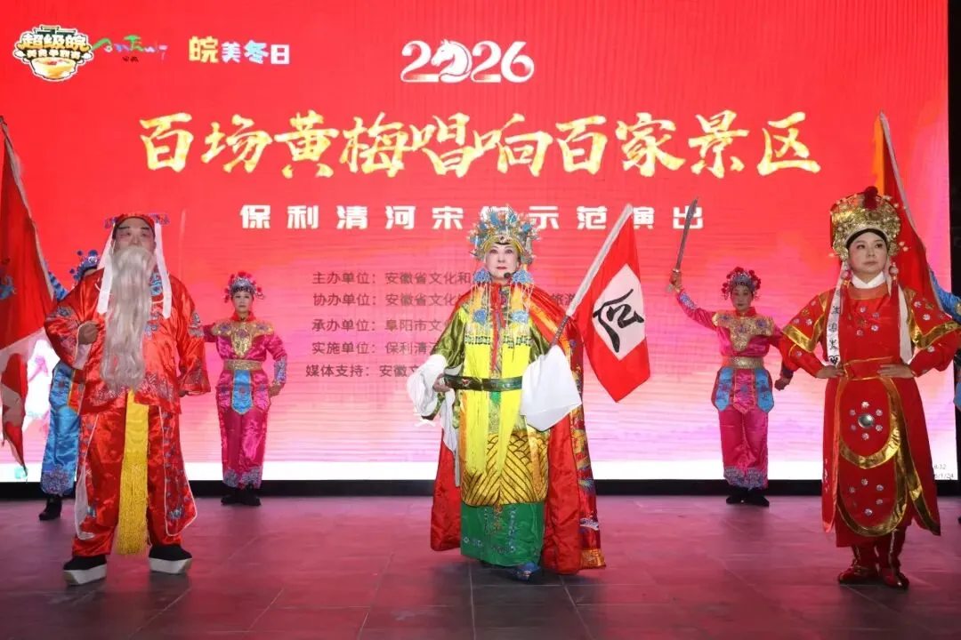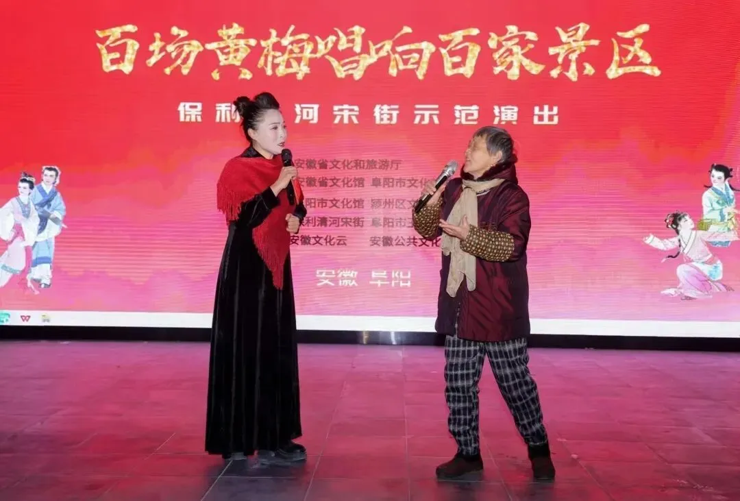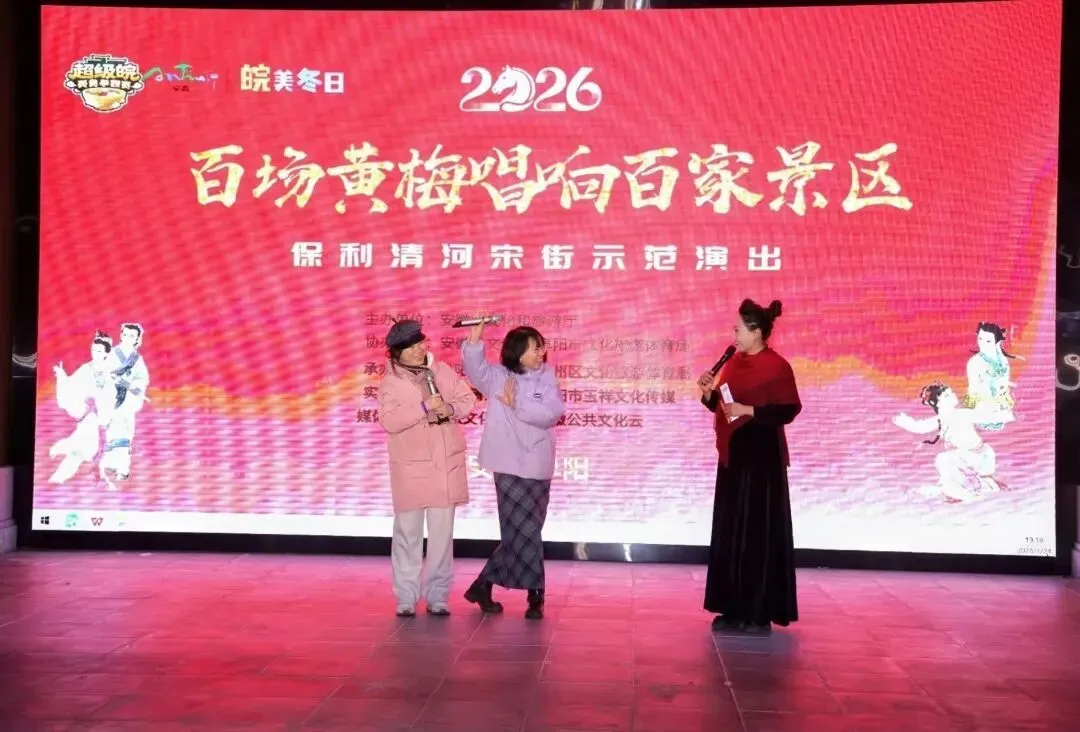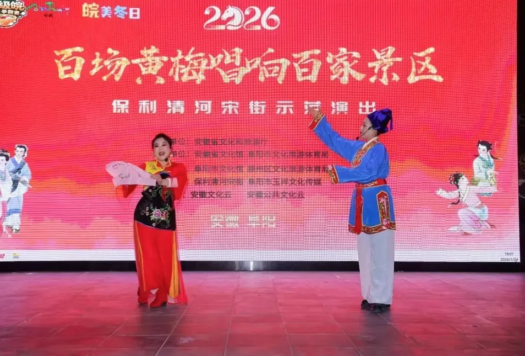 2026年1月24日,由安徽省文化和旅游厅主办,安徽省文化馆、阜阳市文化旅游体育局协办,阜阳市文化馆、颍州区文化旅游体育局承办的“百场黄梅唱响百家景区”保利清河宋街示范演出在热烈氛围中拉开帷幕。