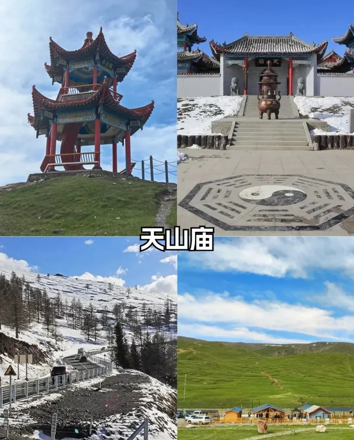 天山路蜿蜒曲折凡三十六盘,道旁山高林密,鹰啭鹿鸣。顺盘山弯道登上天山庙山顶,豁然天开,俯瞰山下,林海莽莽,雪光莹莹,天气多变,一会儿朗月当空,一会儿云遮雾罩,一会儿大雪纷飞。站在山顶远眺盘山公路,鸣沙山、巴里坤草原尽收眼底。天山公路由此分道,急转直下,南去是南山口,北去是口门子。庙外面有个观景平台和观景塔,游人旅客多驻足于此,领略大自然的奇妙景。