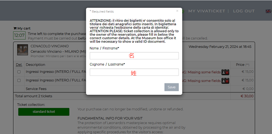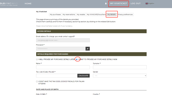 → 在要真正买票之前,如果在注册的时候没有填上所有买票人的信息,那就在这个时候填。登录后,点击第一行的“MY VIVATICKET”,选择”My details”,点“I WANT TO PROVIDE MY PURCHASE DETAILS NOW”。每一位买票人的信息都要填上。Surname是姓,Name是名。选择下方“I DON'T HAVE THE TAX