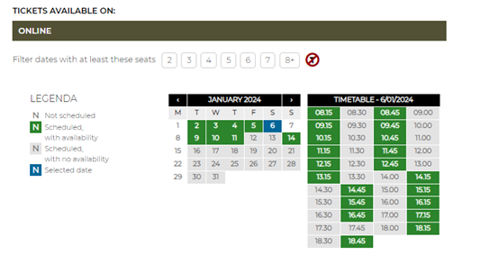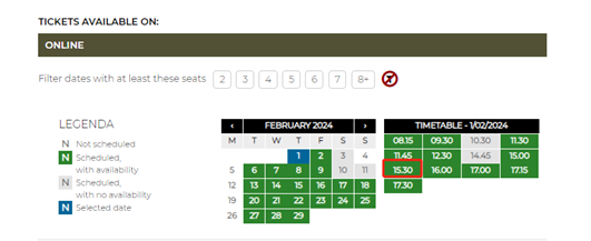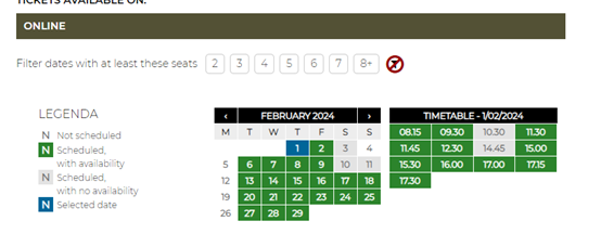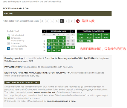 非常需要注意的事情,一般刚放出来的票,当预约人数还不多的时候,网站上是只有门票(15或2或免费)+讲解(9欧元)的门票可预订的,从预约网站上能看出来,如果你看到timetable 只有半点和整点的(时间与下面第5点匹配),那点进去你会发现票价都是24~9欧元不等。只有出现这些非整点半点时间的,说明这些时间段你有可能可以买到仅门票不带讲解的门票。当然,像下图2024.2.1 15:30的,不是讲解时间的票,点进去除了有仅门票的选项,也有+工作室的门票(票价是门票+15欧元)。当然,最早的那个8:15的票是一定纯门票的!