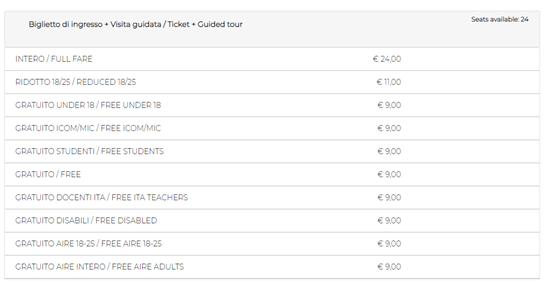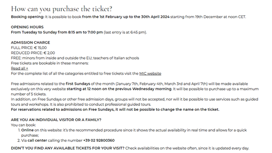 6, 票价:全票15欧元,优惠门票(18~25岁)13欧元(减2欧元),免费票(欧盟非欧盟的未成年人,意大利老师)。