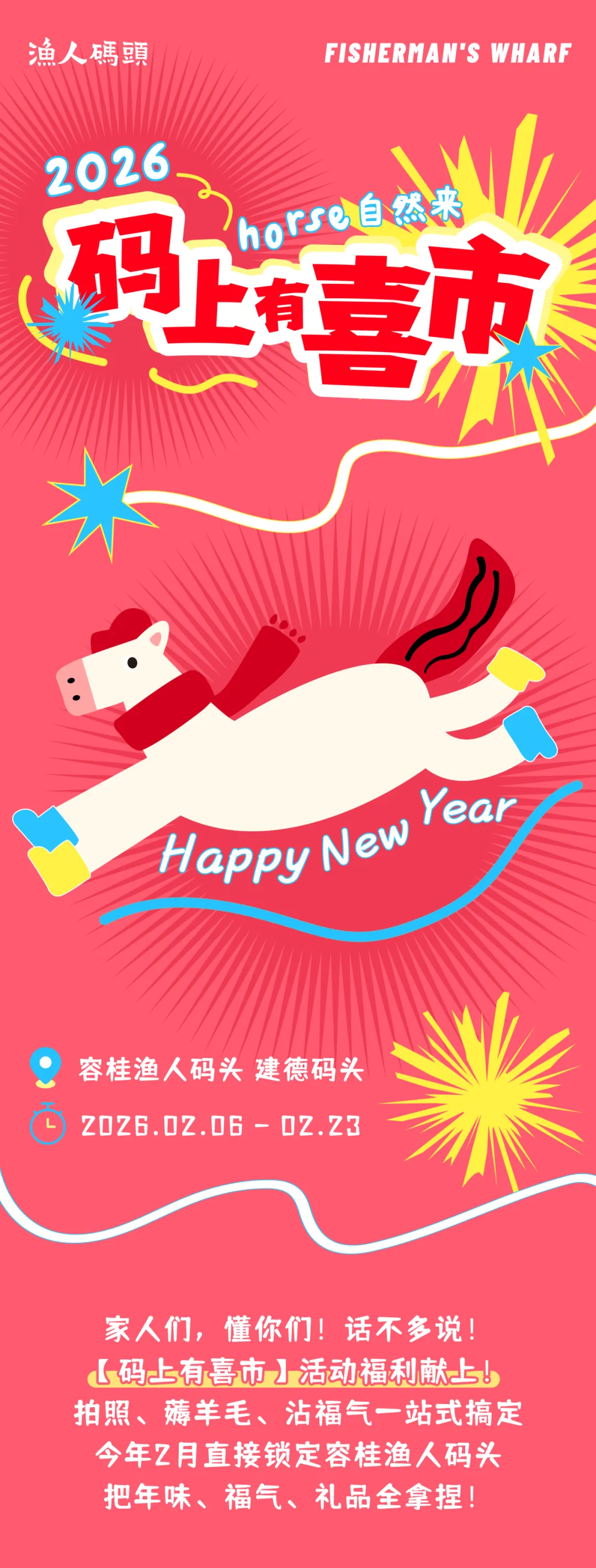 顺德容桂渔人码头将以“马年年俗+潮流创意”为核心,规划约50个特色摊位,于新年倾力打造集逛、赏、玩、购于一体的新春年货节,期间还有醒狮贺岁、型男巡游、财神送福等特色表演。
