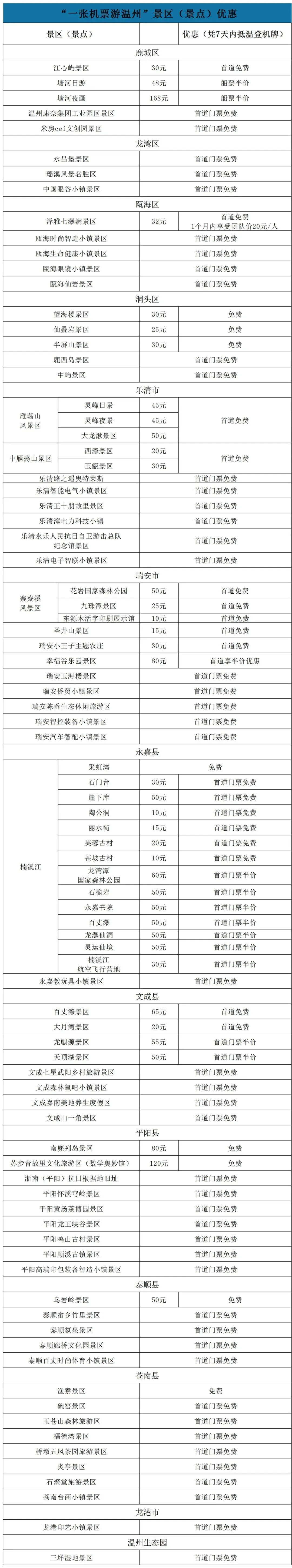 温州上线 “一张机票游温州”活动:海内外游客凭7天内抵达温州的机票或登机牌,即可在全市范围内享受:26家收费景区景点免票游,12个景区景点门票和项目5折及以下优惠,全域可免费游览景区景点多达75个。