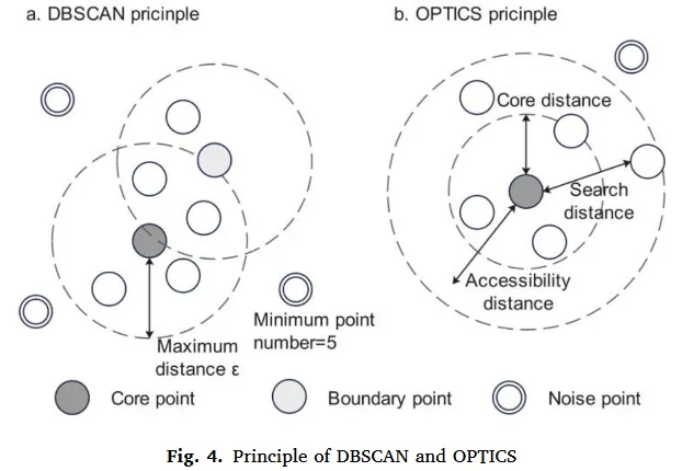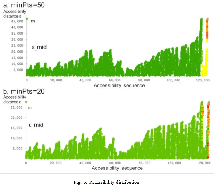 停留区域识别与优化:利用最优距离算法(OPTICS)优化密度梯度非均匀性,提高聚类准确性。通过OPTICS算法识别游客停留区域,并进一步优化聚类结果,确保识别出具有实际意义的游客兴趣区域。