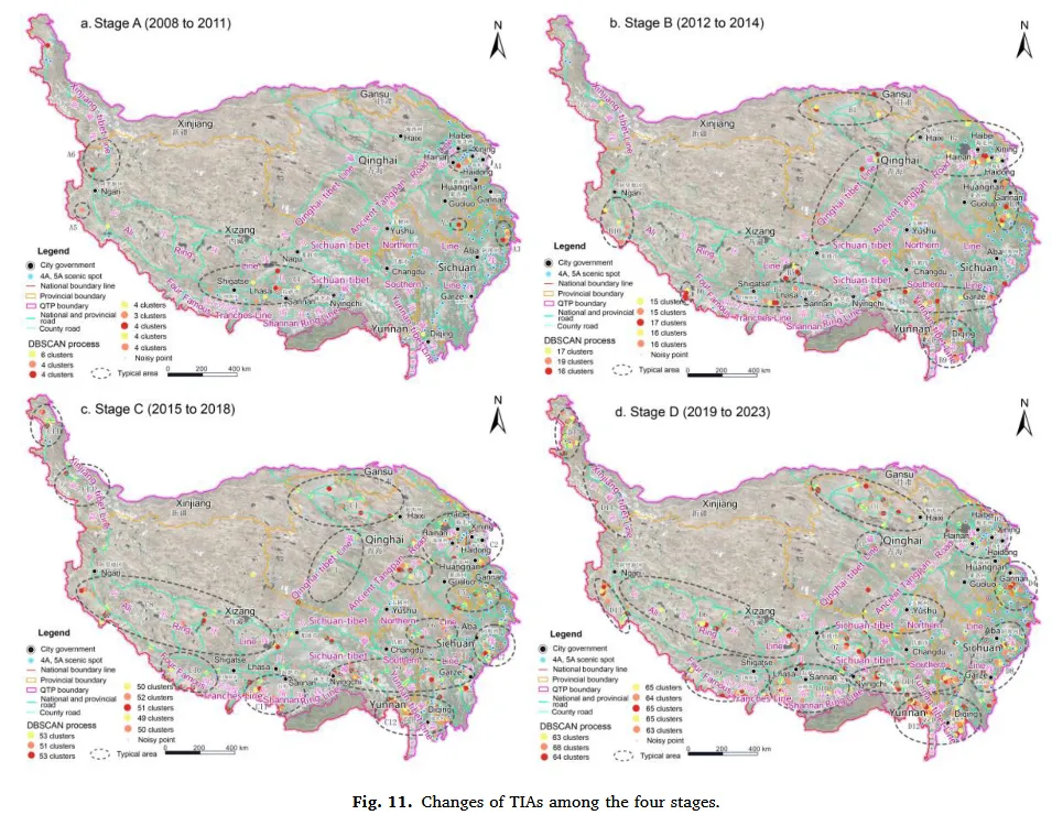 游客兴趣区域演变:研究揭示了青藏高原游客兴趣区域的四个明显阶段——点状成核、线性扩展、网络增殖和多集群再平衡。这些阶段反映了旅游资源的“多点分布广泛”特性,显示出高多样性在东部地区的分布特征。最初,游客兴趣区域主要集中于高景观价值区域和知名旅游城市,如拉萨和西宁。随着时间推移,这些区域逐渐沿主要交通干线扩展,形成线性分布,并最终在网络化过程中实现多中心均衡分布。