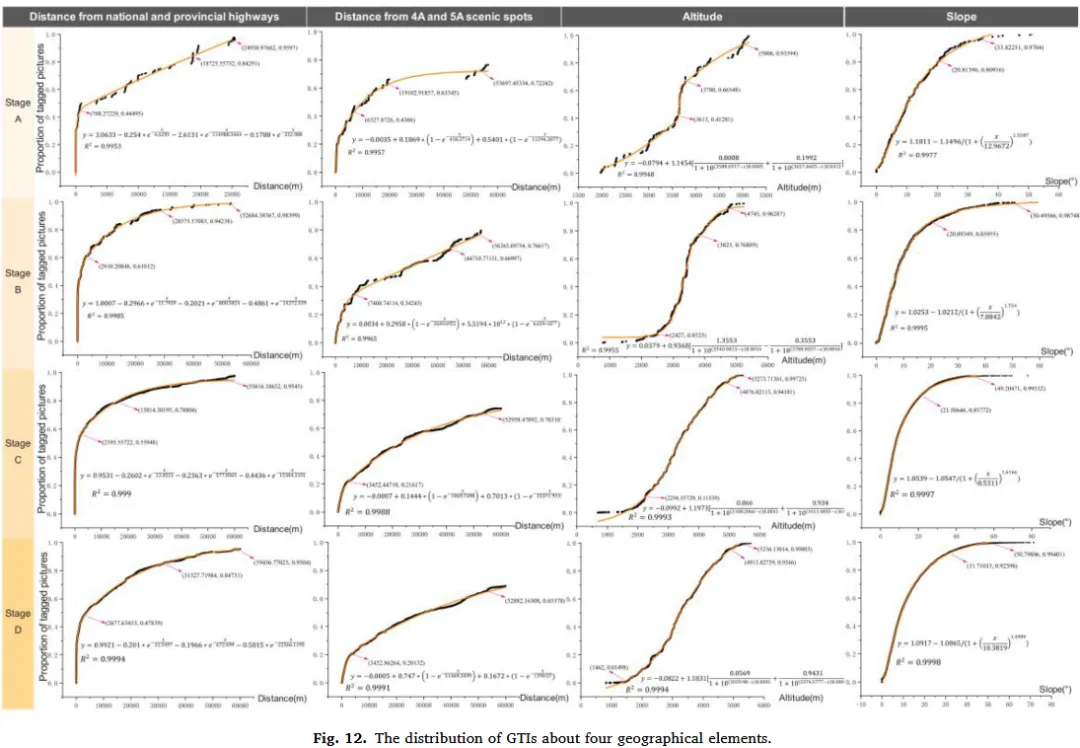 地理特征拟合:将游客停留区域的兴趣点与地理特征(海拔、坡度、与主要交通干线和景点的距离)进行拟合,分析其空间分布和演变趋势,揭示游客行为与地理环境之间的关系。