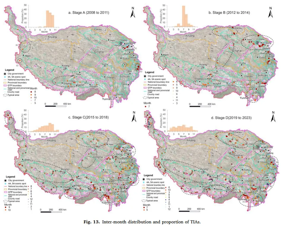 游客兴趣区域的空间分布:游客兴趣区域主要集中在海拔3000米至4500米之间,沿国家和省级高速公路60公里半径范围内分布。这种分布模式不仅受到交通基础设施改善的影响,还反映了游客对高景观价值区域的偏好。此外,随着季节变化,游客兴趣区域也呈现出不同的月度分布特征,夏季集中于东部边缘地区,春秋季则逐渐向高原内部扩展。