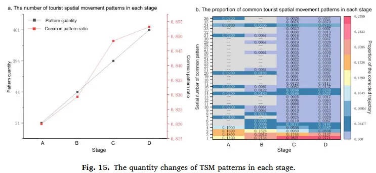 游客空间移动模式:研究识别出36种常见的游客空间移动模式,主要包括短距离简单路径结构、中短距离旅游活动和复杂路径结构。短距离模式主要集中于单一县区内的旅游活动,而中短距离模式则沿主要交通干线在多个县区间移动。此外,研究还发现了基地营模式等复杂路径结构,这些模式反映了游客在高原地区对基础设施和服务的依赖。