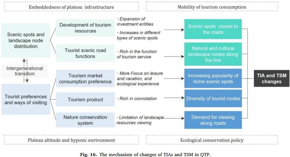 多因素协同机制:研究揭示了高原旅游空间模式转变的三方协同机制,包括资源设施供应、旅游需求转变和资源管理调控。多利益相关者协作、代际需求变化和政策环境互动共同推动了游客兴趣区域从单一景点向线性走廊和网络结构的转变,形成了“点-线-面”的旅游空间组织模式。