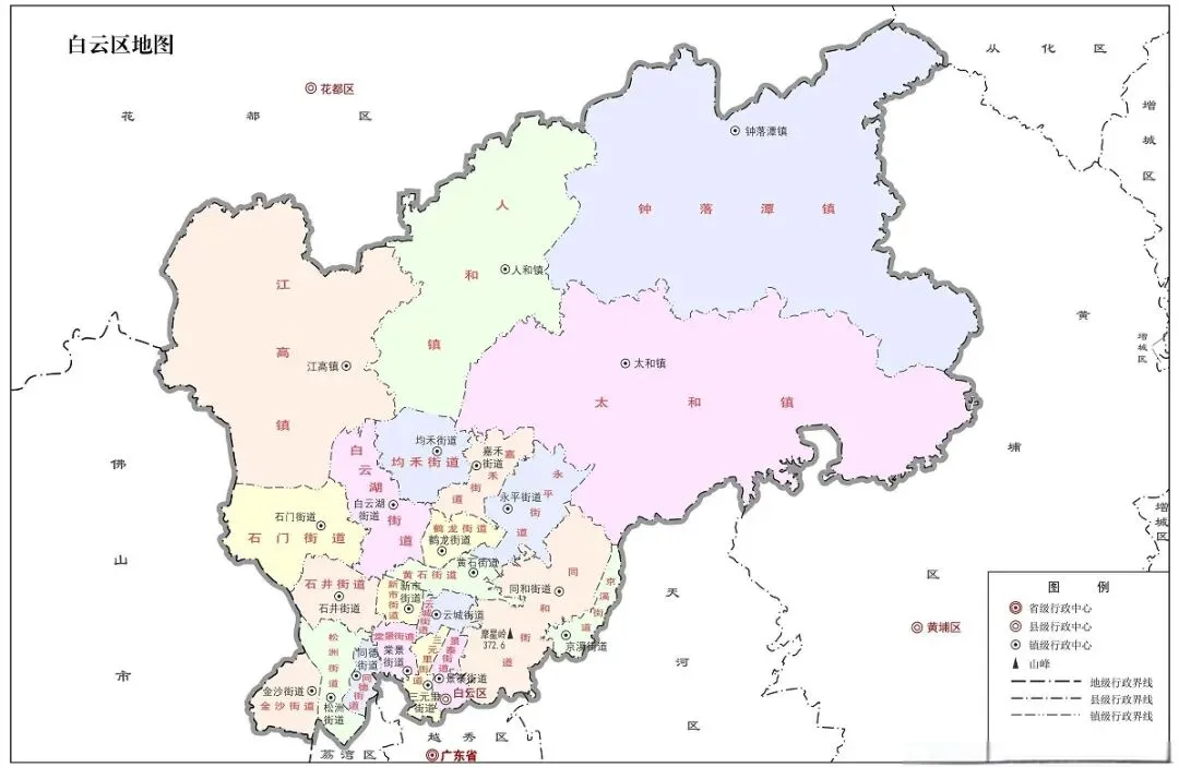 白云区辖20个街道、4个镇。即三元里街道、松洲街道、景泰街道、黄石街道、同德街道、棠景街道、新市街道、同和街道、京溪街道、永平街道、嘉禾街道、均禾街道、石井街道、金沙街道、云城街道、鹤龙街道、白云湖街道、石门街道、龙归街道、大源街道和人和镇、太和镇、钟落潭镇、江高镇。区政府驻景泰街道广园中路。