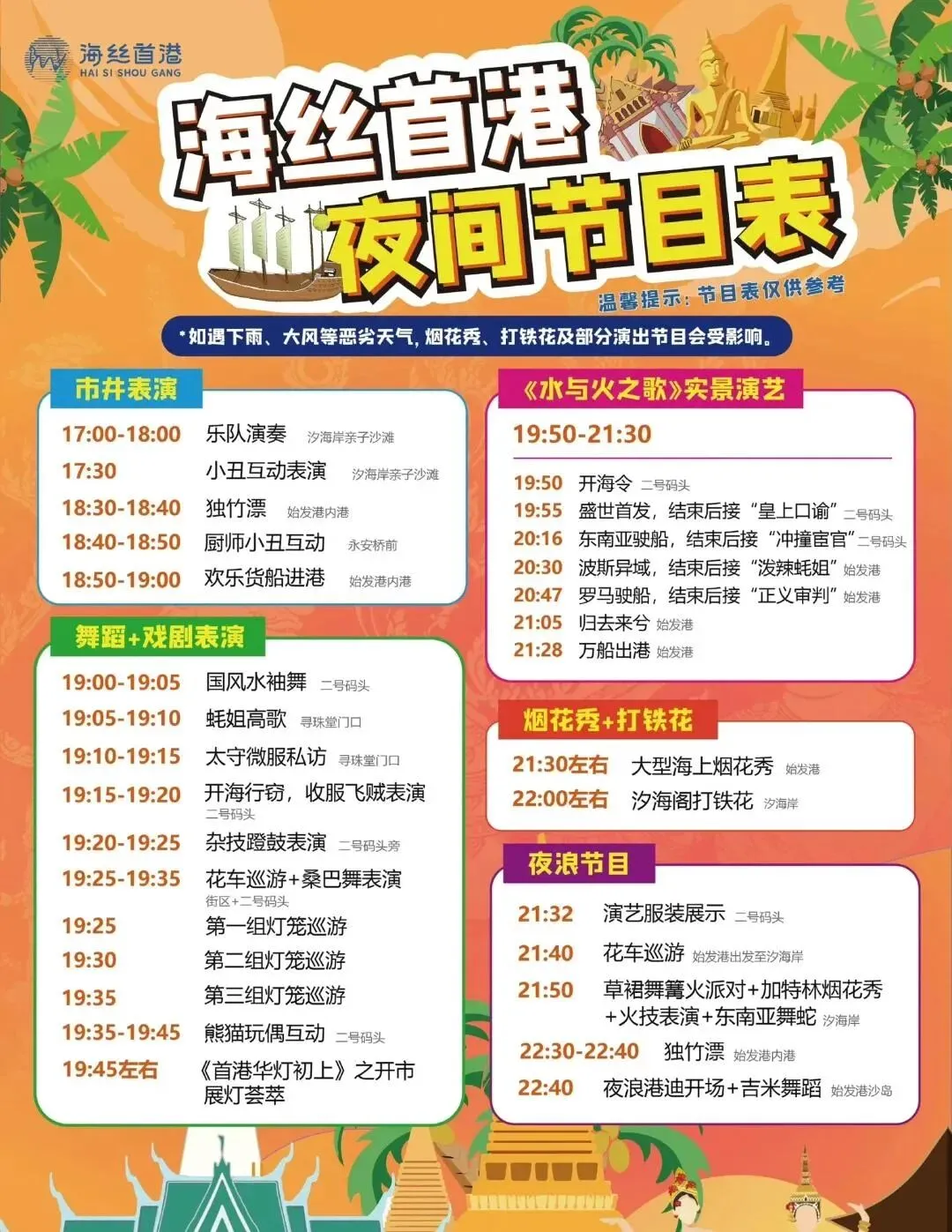 18:00-20:10:港口市井生活体验,街头近身戏剧表演、异域风情表演、各类海鲜美食、特色小吃,感受惬意的海港旅行生活。