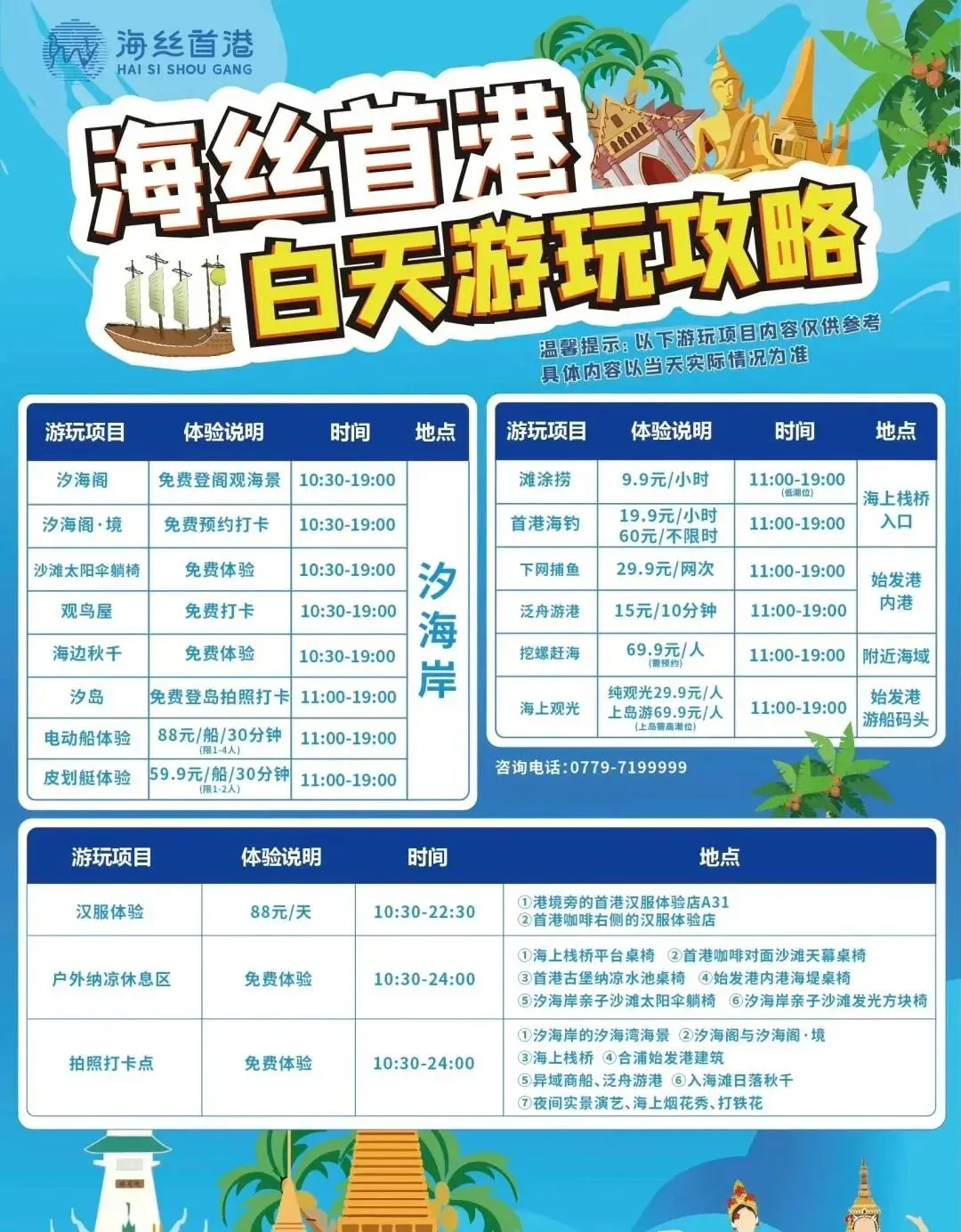 👣穿舒适鞋,提前规划行程景区内步行道和观景台众多,记得穿舒适的鞋子;带上防晒用品和雨具,以防不时之需;提前规划行程,充分利用时间,领略更多北海美景!除了海丝首港,涠洲岛、银滩、北海银滩等地也值得一游。在这里,你可以尽情享受北海的海洋风情和无尽美景!