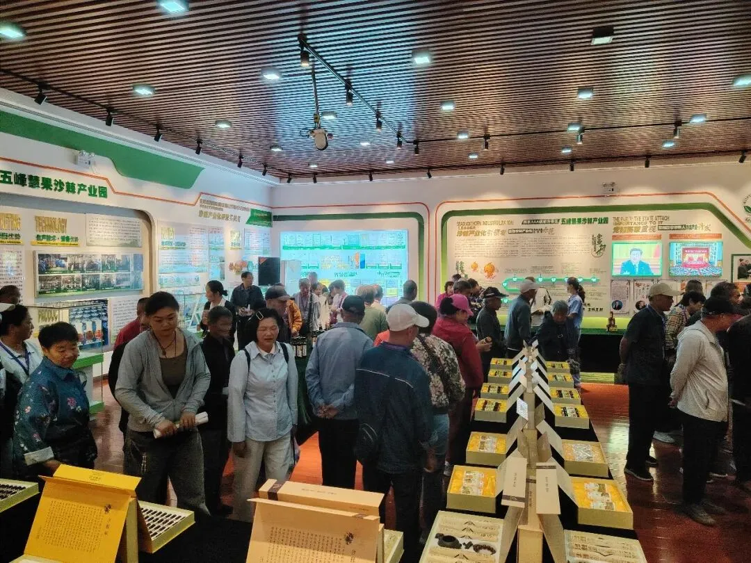 (游客在产品展示厅详细品尝了解品类新奇的沙棘系列产品)