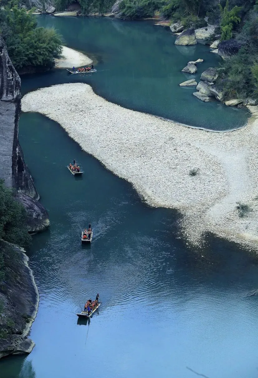 盈盈一水的九曲溪,在山间穿行,构成了“一溪贯群山”的美景,武夷之魂在九曲溪,可以说没有九曲溪的流经,武夷山的风光就变得没那么有灵性。当地人说“不坐竹排,武夷白来”,哪怕你只有半天时间待在武夷山,也得游览一次九曲溪,由此可见九曲溪的重要地位。