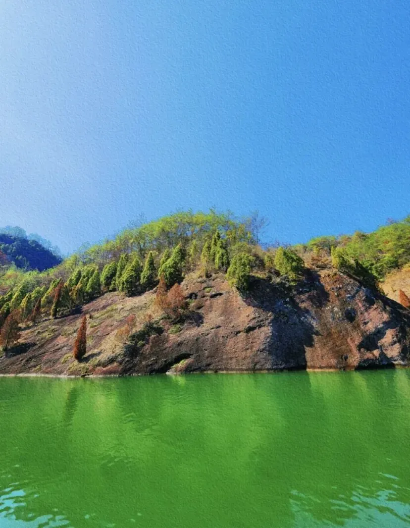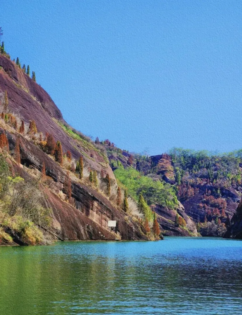 蓝天白云,碧水丹崖,多想化作一只鸟儿,在大金湖上空自由翱翔。泛舟上清溪时,忍不住偷偷将手放入水中,感受那一瞬的清凉,赤壁蓝天,碧波荡漾,这一幅山水之画,乃是天然之美。