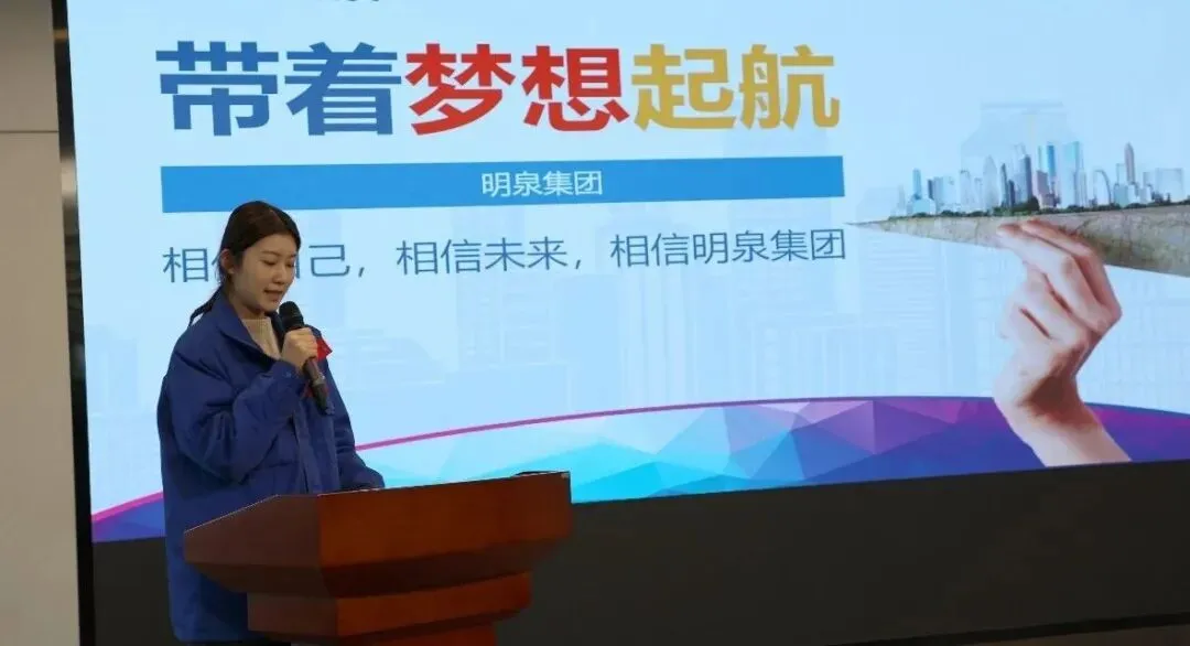 座谈会上,学子们观看了展现本土青年奋斗精神的宣传片《青春无惧》与明泉集团形象片《自强不息实业报国》。