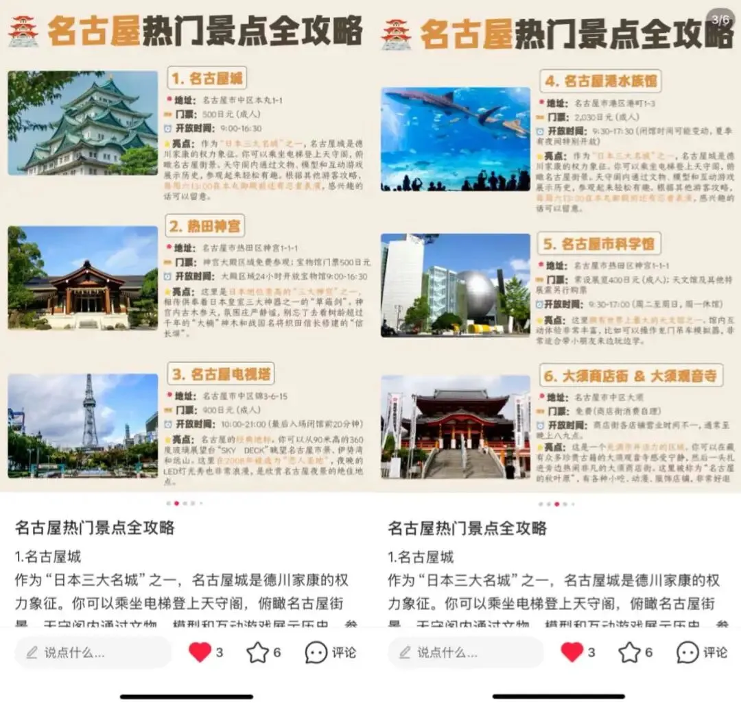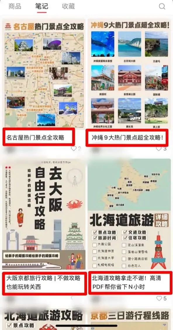 博主还有一个点做的很好,就是每个笔记的标题,他都做了优化的,标题都是大家经常会搜的词语,比如:名古屋热门景点全攻略、冲绳9大热门景点超全攻略、大阪京都旅行攻略等等……