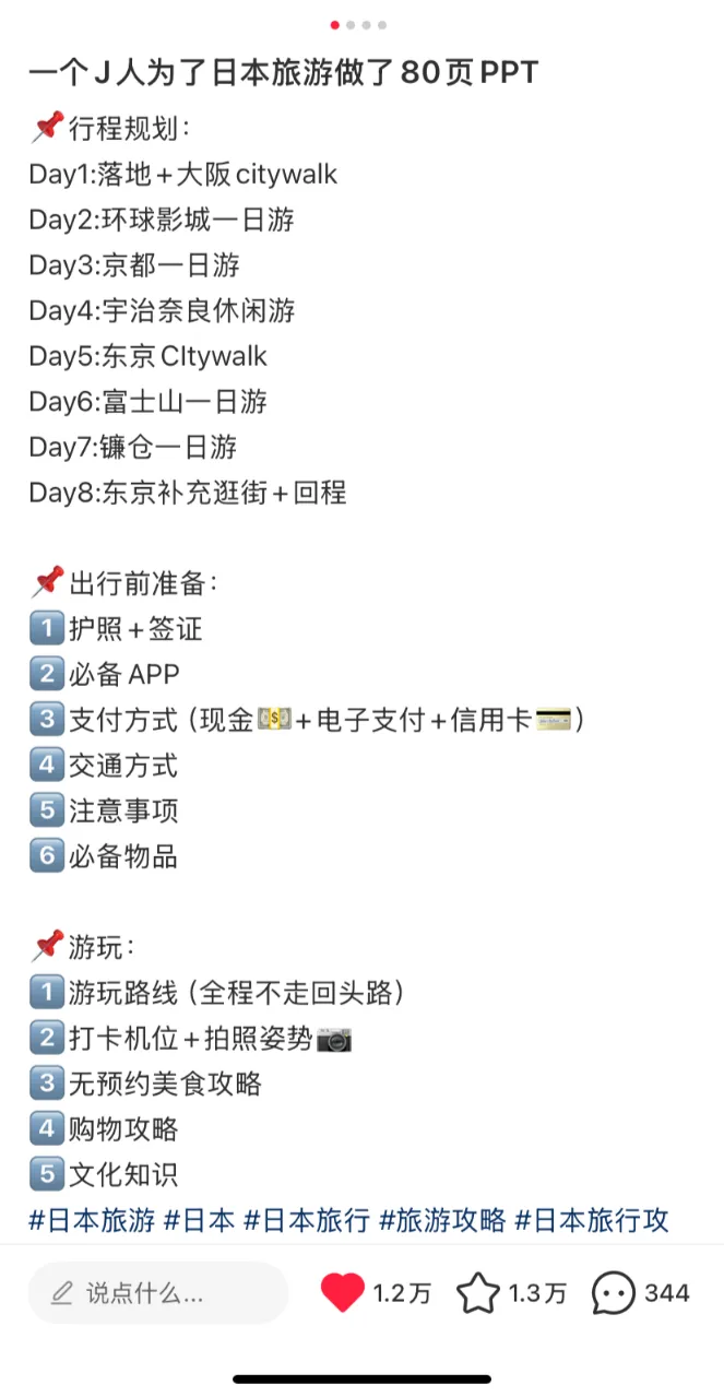 还有一种玩法,就是非人设型账号,就是说,你不一定真的去日本旅游过,你也能做出这样的旅游攻略账号,大部分笔记,都是图文为主的,一样可以做到很不错的成绩。