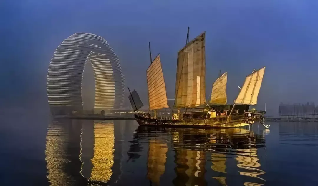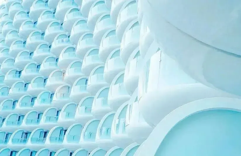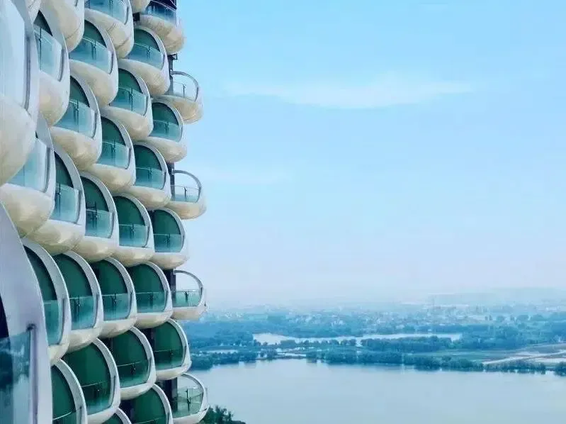 酒店像一艘耀眼夺目的风帆立于太湖畔,外观设计感十足,2000多个椭圆形的纯白色“船舱阳台",犹如一粒粒晶莹的"太湖明珠"。