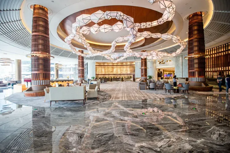 龙之梦钻石酒店以六星级标准打造,11米高挑空的酒店大堂简洁时尚,设计感十足。